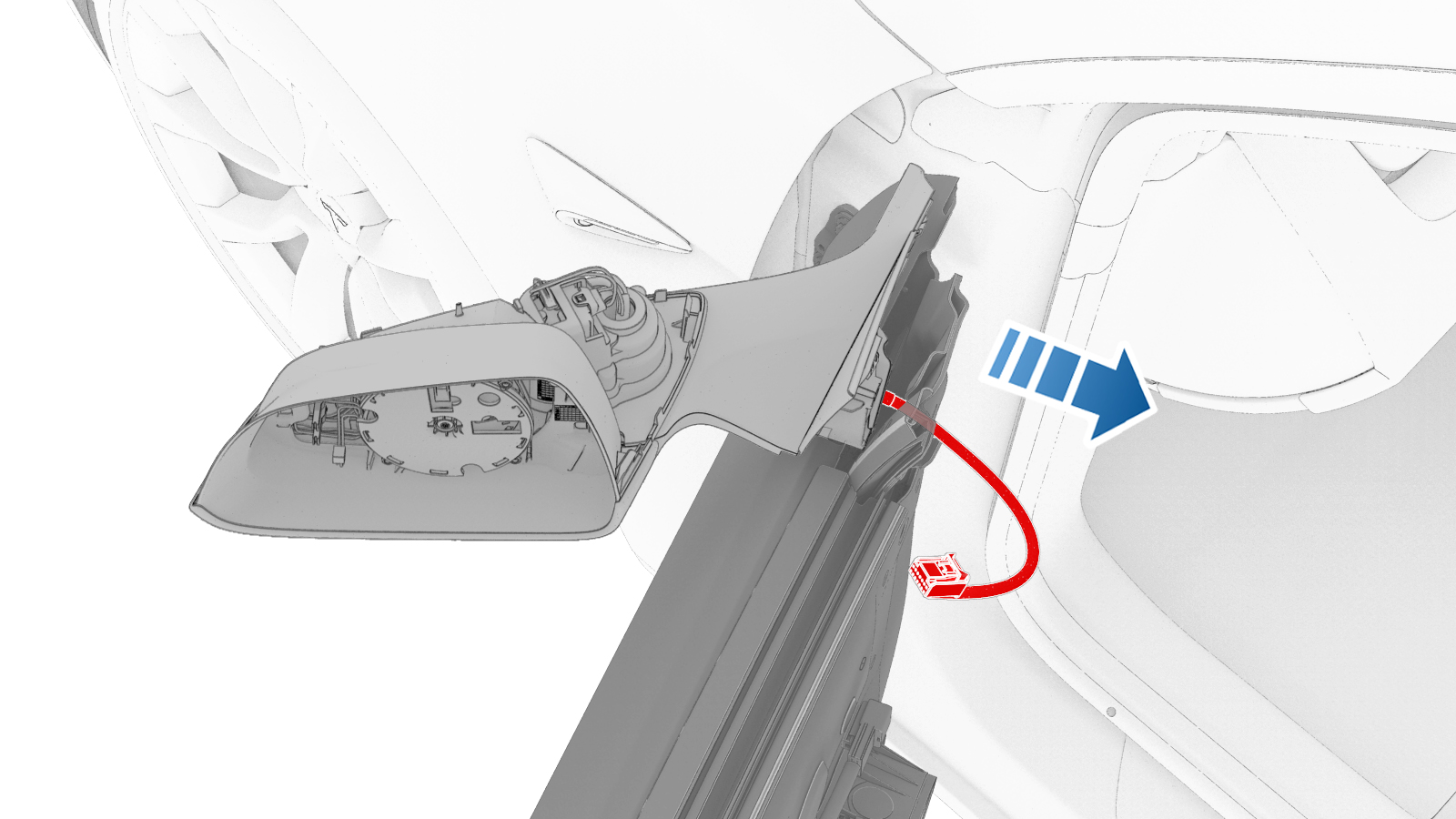 推动索环穿过左前车门,向上移动后视镜线束,同时将其穿过后视镜总成,以将左前后视镜总成从左前车门上彻底拆下。