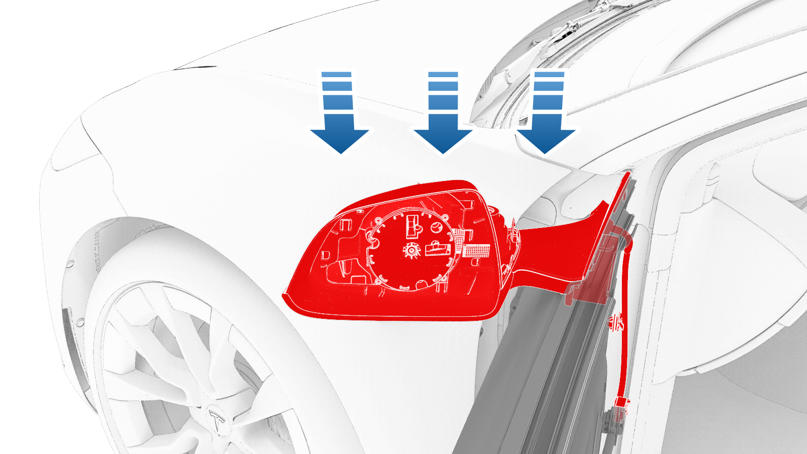 将后视镜线束穿过车门,再将左前外后视镜总成放置在左前车门上,以备安装。