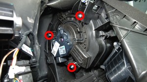 拆卸将 HVAC 鼓风电机固定到 HVAC 模块的螺栓(3 个),然后将鼓风机电机从车辆上取下。
