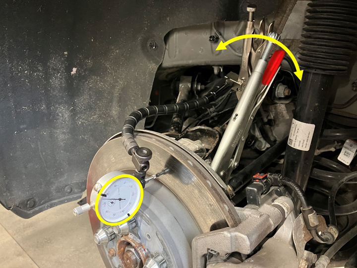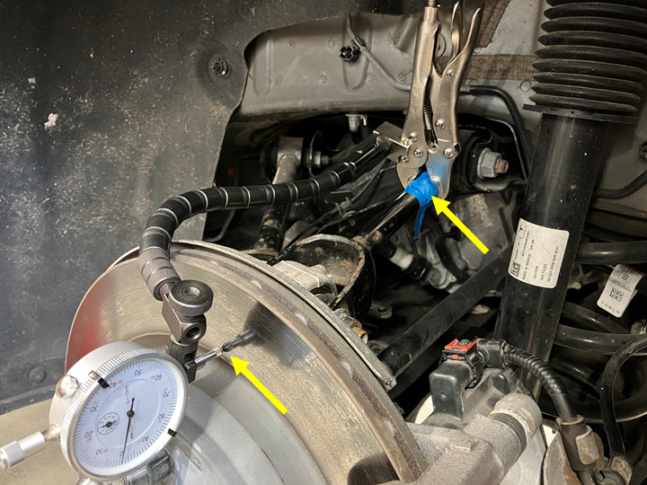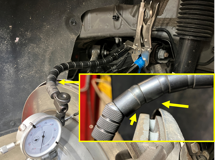 注请注意挠性杆的夹紧位置及走向。将指示杆紧固连接到制动盘摩擦部件最低处。将测量杆与上尾连杆对齐,确保正确下压指示杆,使工具可双向移动且不会触底。将测量值设置为零。确保挠性杆未触碰到制动盘和护板。