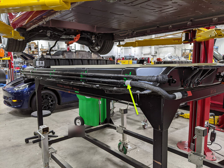 注Use alignment rods. Be sure that the coolant hoses do not get caught on the alignment rods. Caution not to damage HV cable. Do not fully lower the vehicle onto battery (this will help with installing battery bolts).