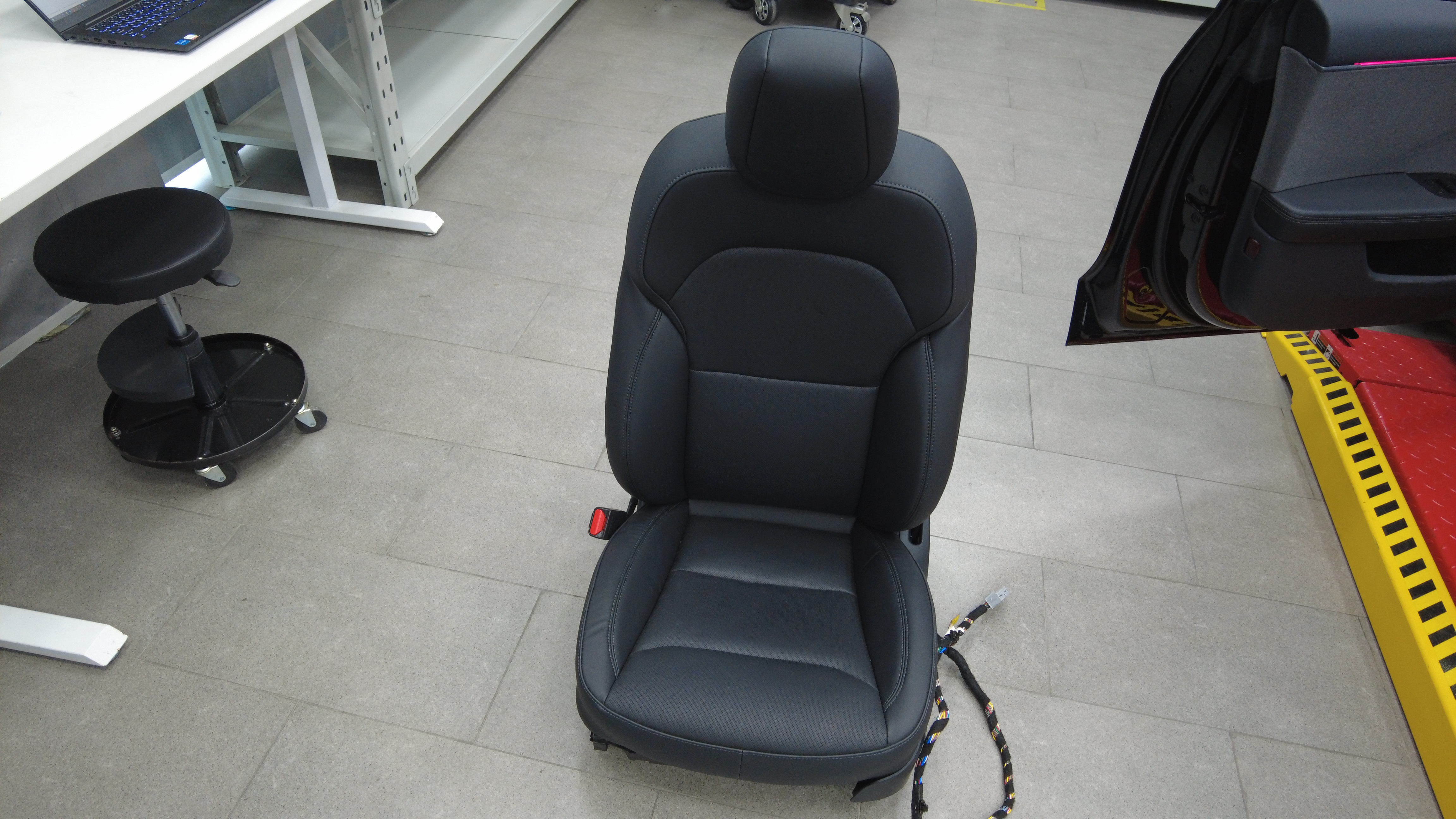 在助手的帮助下,将第一排 LH 座椅放入车中。