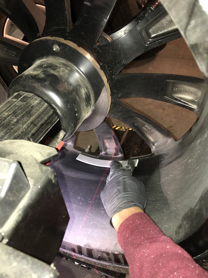 在平衡机投射的红色激光线中央处安装新轮毂配重块。