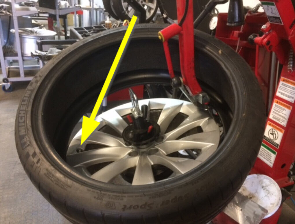 警告将胎压监测系统传感器放置在轮胎机操作臂前侧,以确保在轮毂转动时,操作臂不会损坏胎压监测系统传感器。