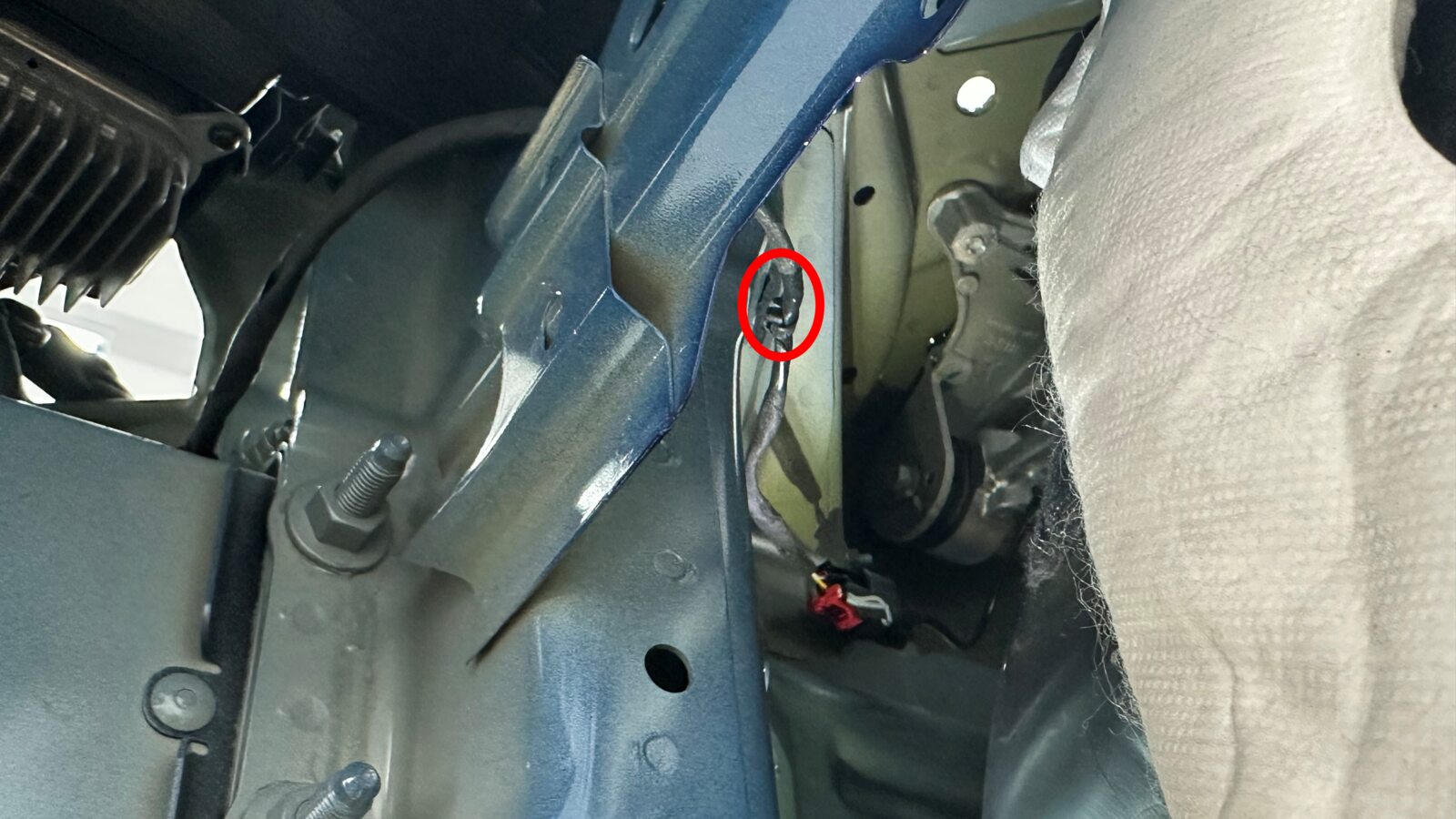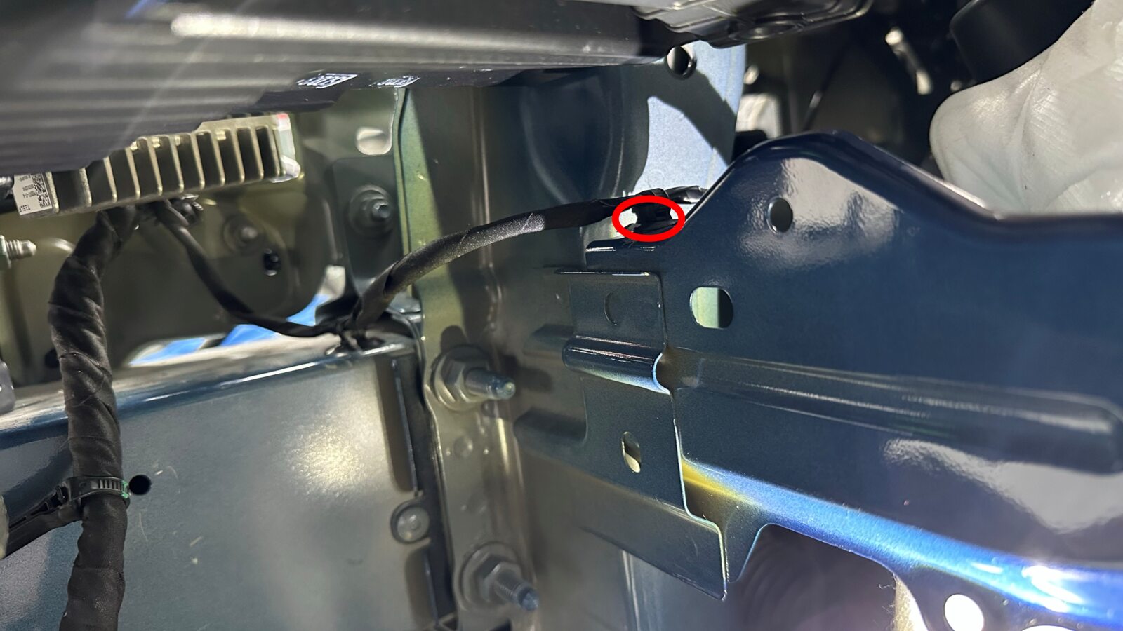 注确保塑料外壳朝向正确,卡子朝向车架纵梁。将线束向下送入饰板后。