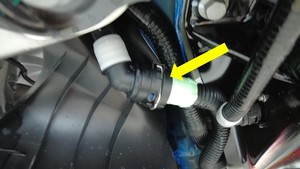 Use a clip prytool to release the clip that attaches the front drive unit inverter inlet hose to the front drive unit.