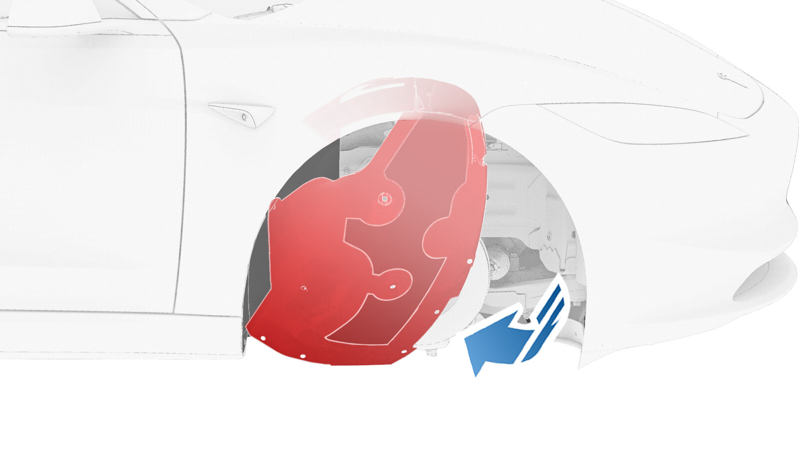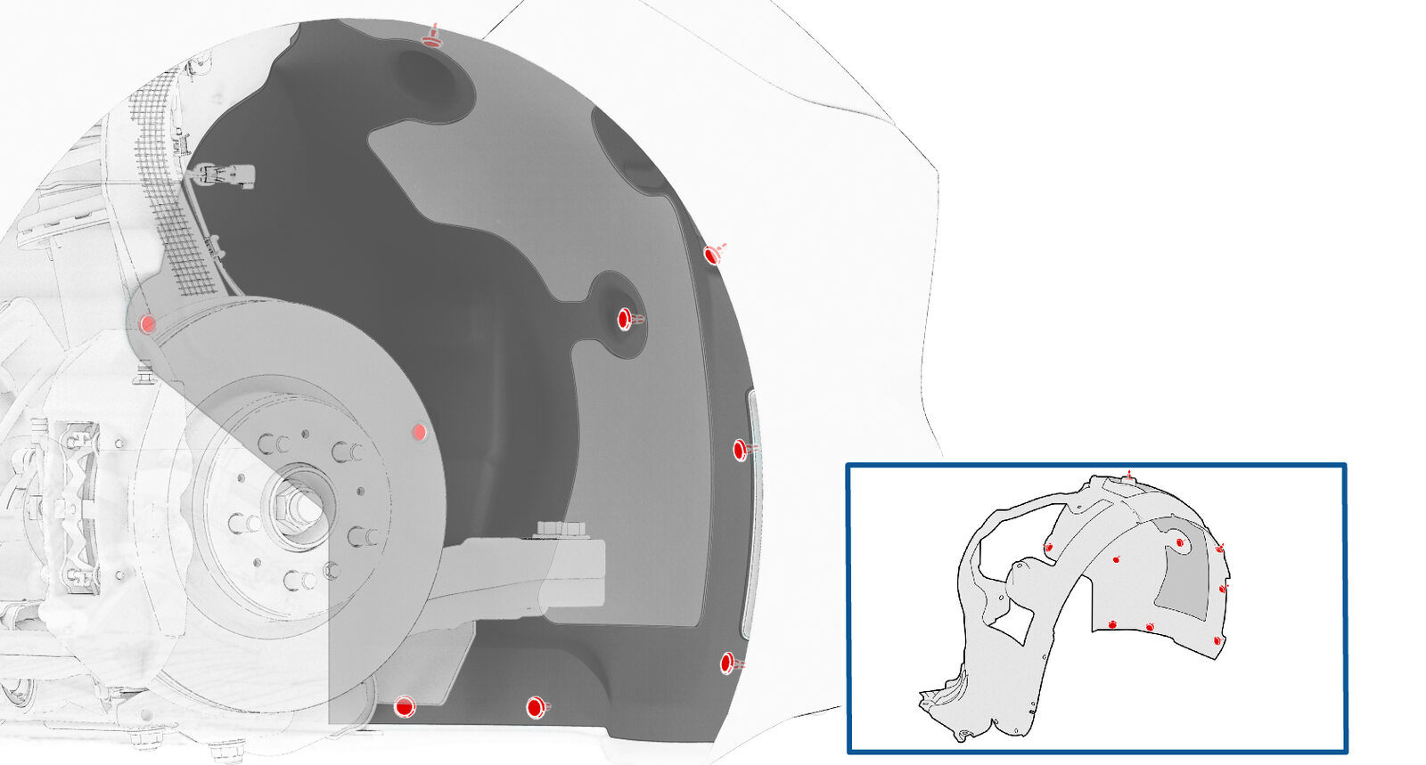 将右前轮拱内衬安装到车辆,然后安装将右前轮拱内衬固定到车辆的推拉式卡子(9 个)。