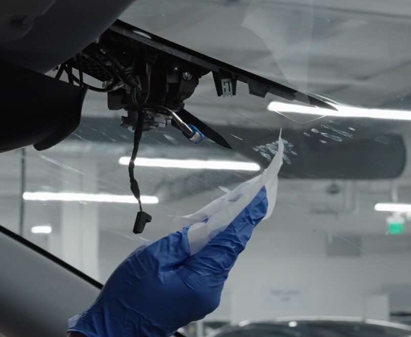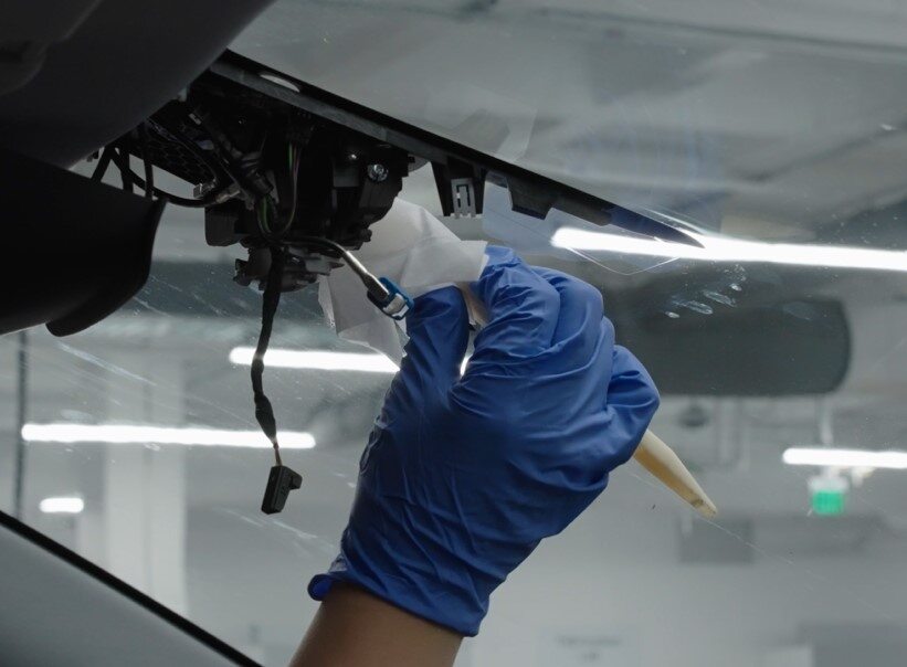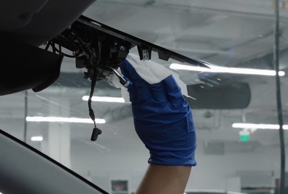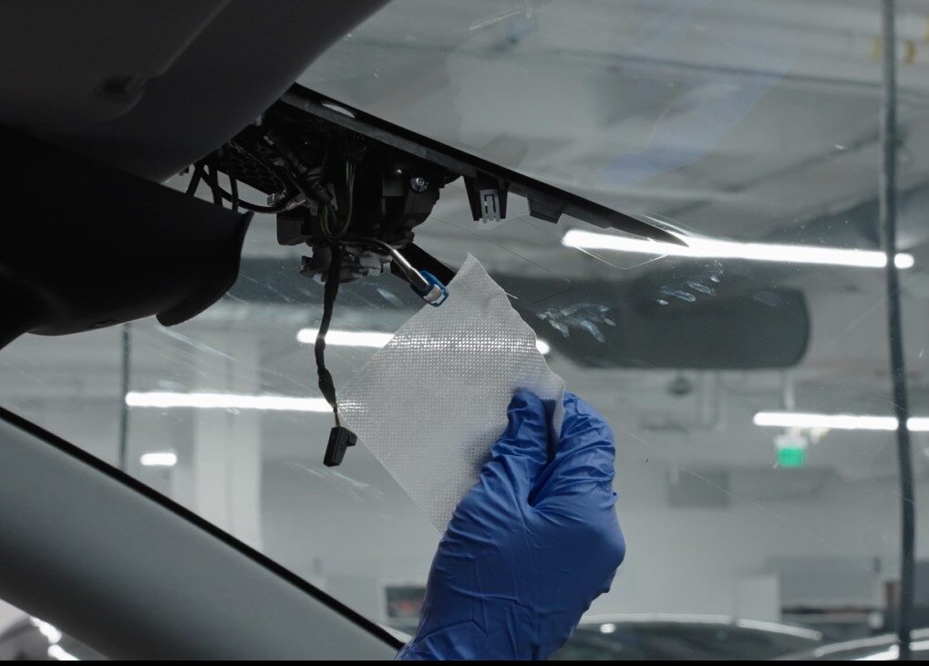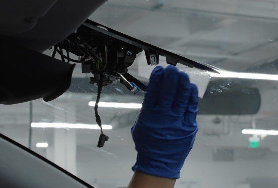 按照如下步骤清洁前置摄像头区域挡风玻璃的内表面: