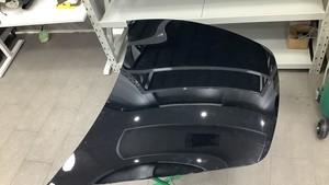 在协助下,将前备箱盖从车辆上拆下,然后将其放置在有垫板的平面上。