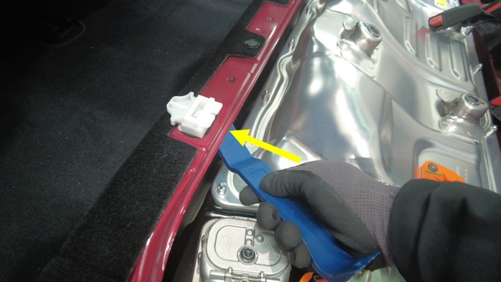 松开将卡子固定到车身的锁片(2 个),然后将其从车辆上拆下。