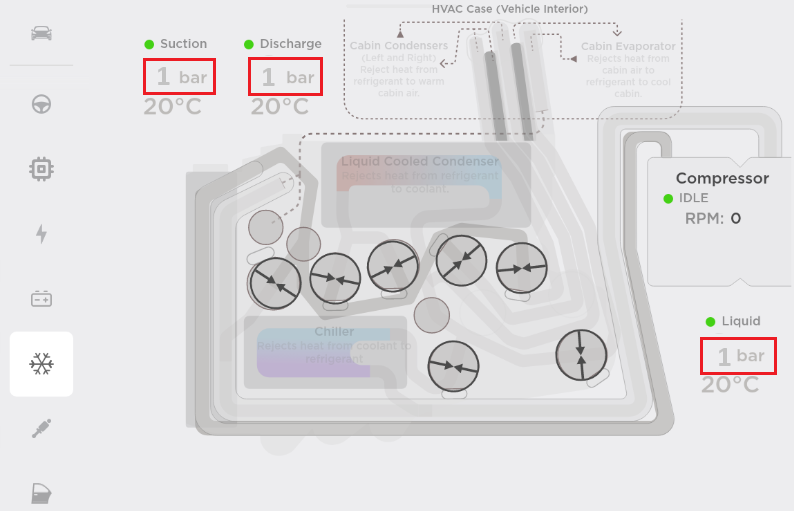 在触摸屏上,确认制冷剂系统压力处于大气压水平(大约 1 巴)。