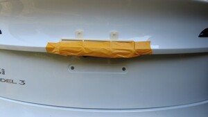 将后部 Tesla 徽标对齐工具 (1944666-00-A) 安装到后备箱盖上的正确位置,然后用胶带将工具固定住。