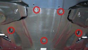 在将中间流线型护板后部固定到车辆的螺栓(5 个)螺纹上涂抹一小滴 Loctite 222 。