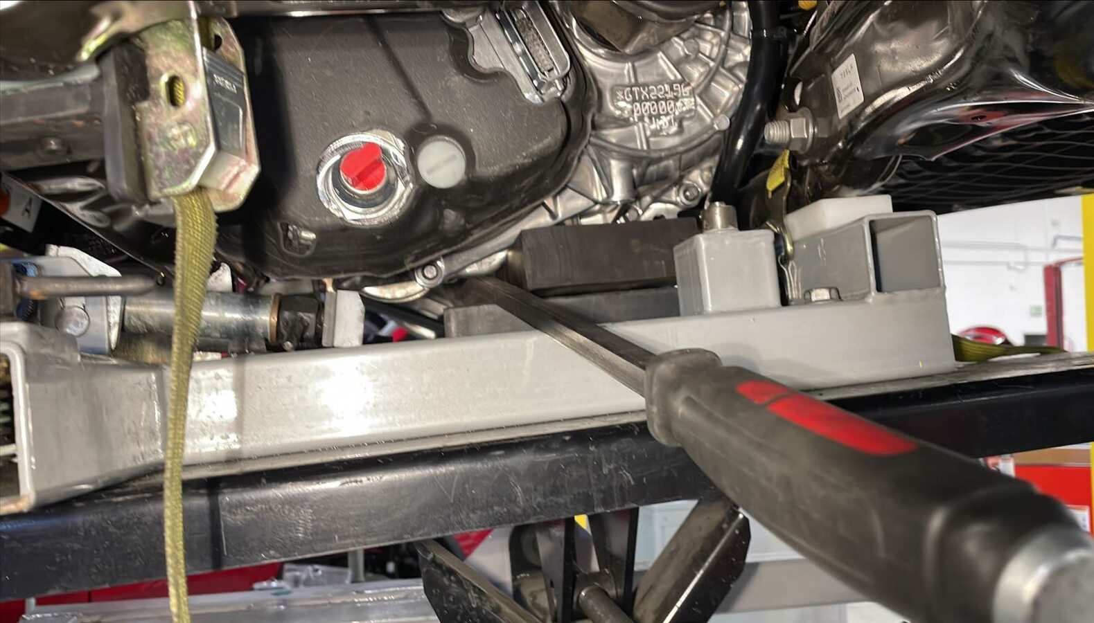 松开将后副框架固定到副框架举升工具的固定带 (x3)。