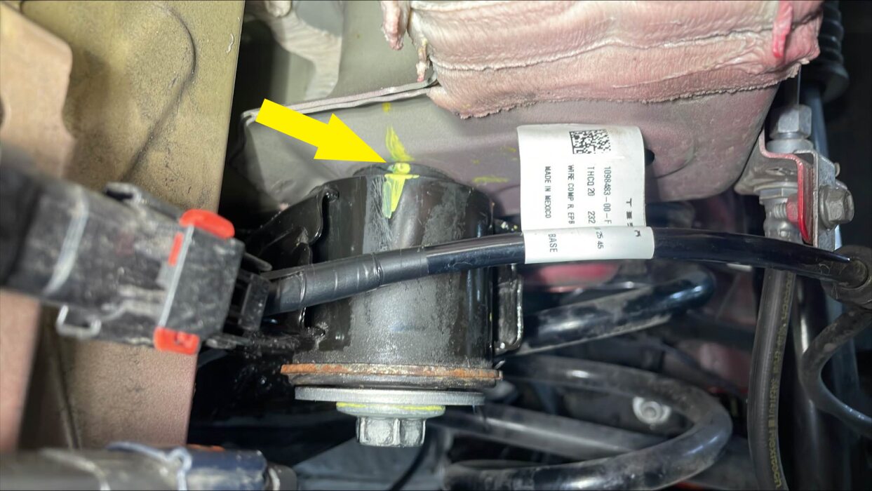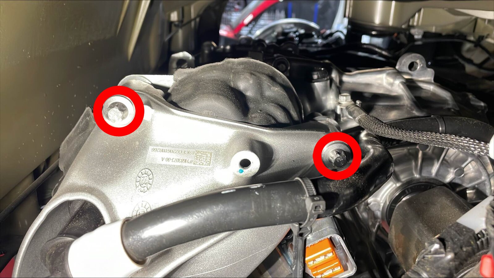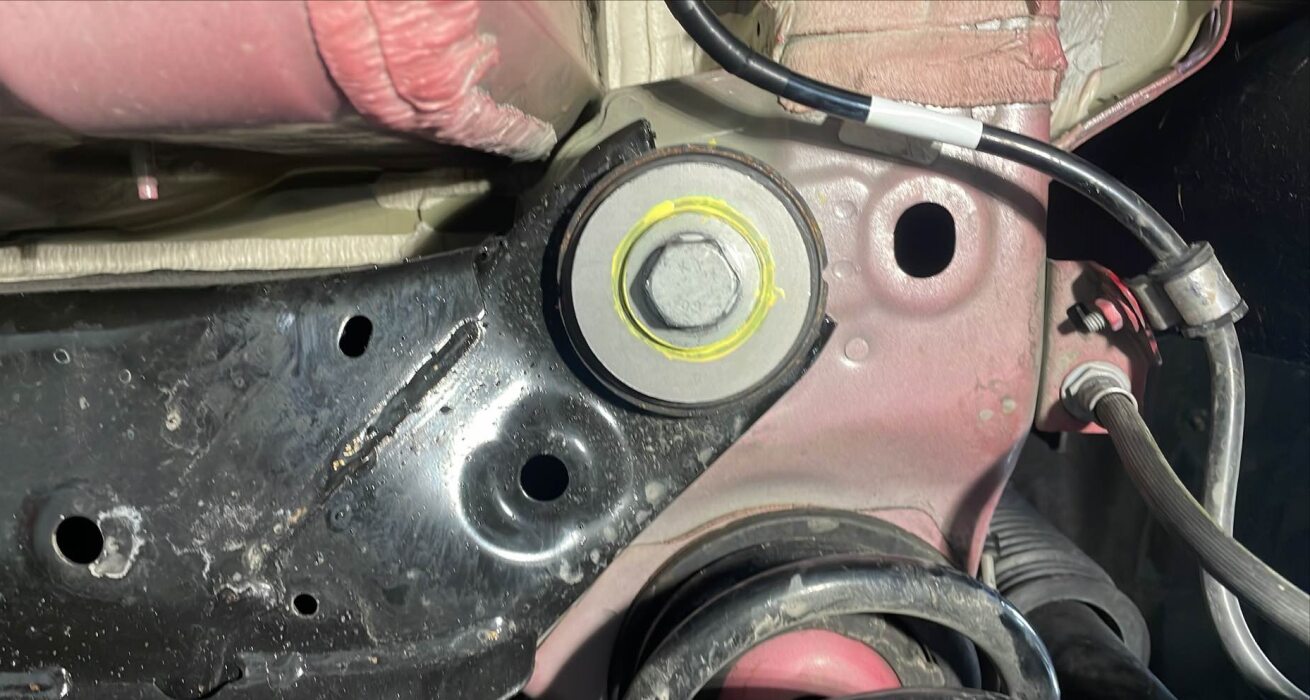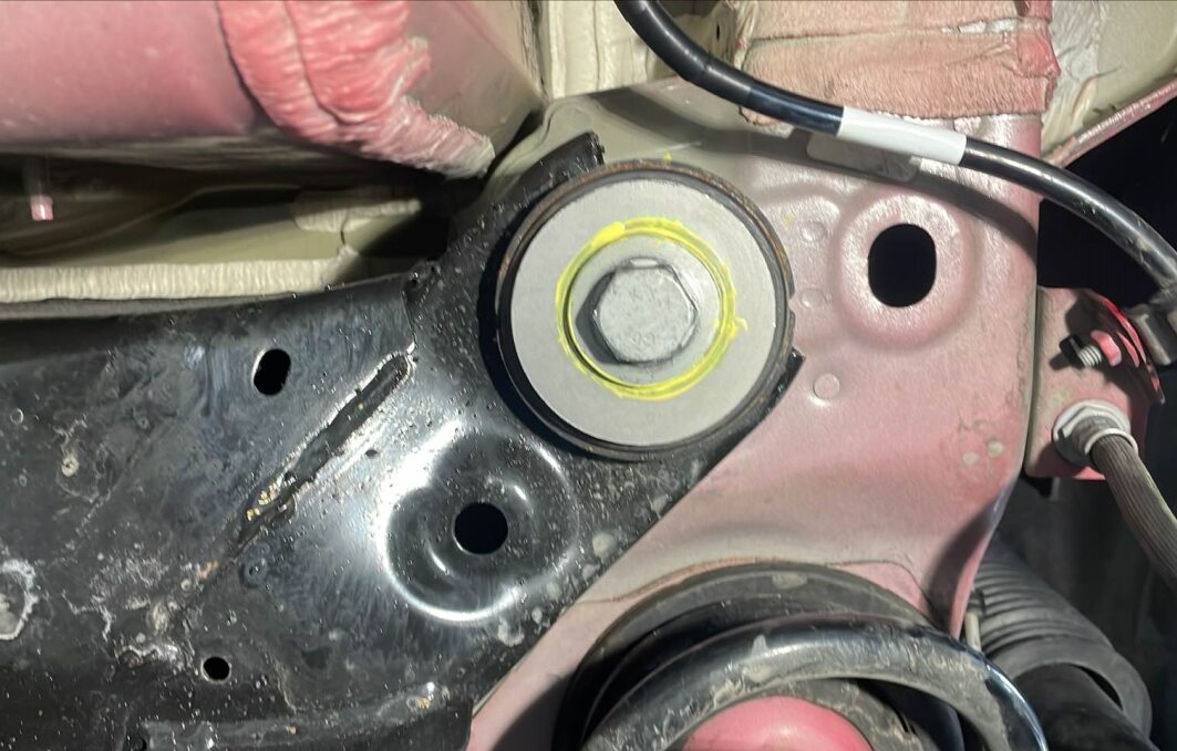 使用油性记号笔在 LH 和 RH 后副框架安装螺栓周围描画,以便稍后在安装副框架期间重新对准螺栓。