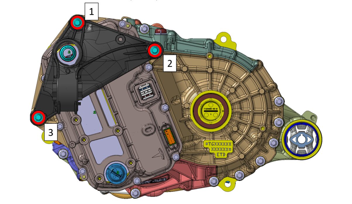 将后驱动单元左侧支座安装到后驱动单元,然后安装并手动拧紧新的螺栓(3 个),将支座固定到驱动单元。