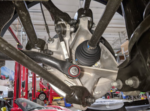 注部分降下副车架;由于多个部件仍相连,降下副车架时请谨慎操作;请勿使这些部件承受过大的应力;减震器和制动钳仍相连;建议降下约 3.25 英寸或 8.25 厘米。