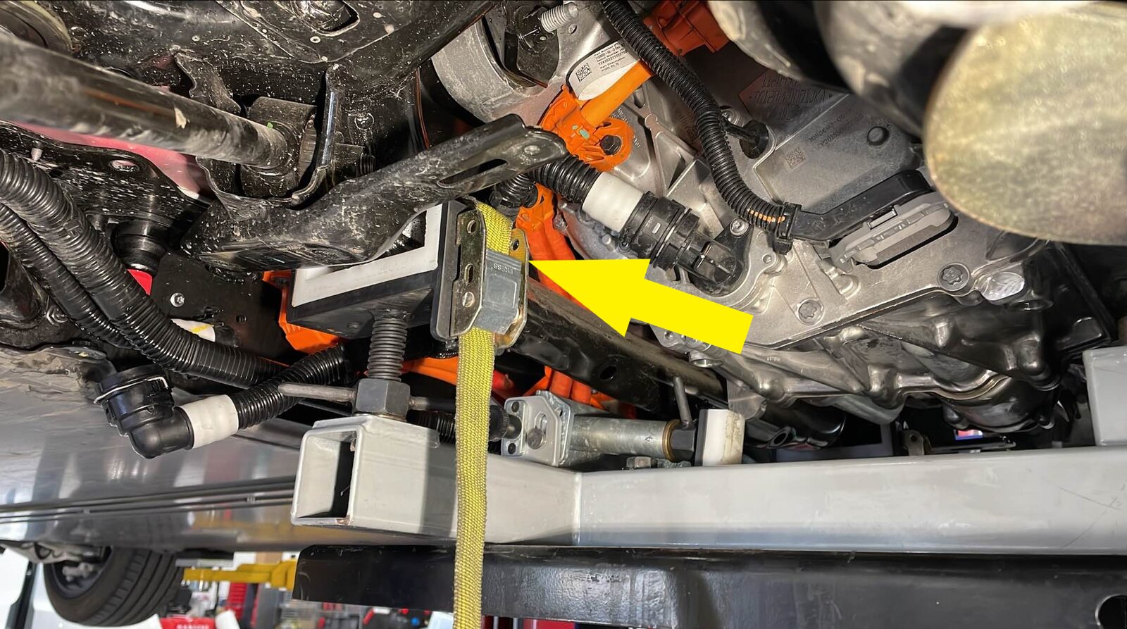 注3 个系带;将系带末端金属钩固定到副车架举升工具上的钩环上,拉动系带直至固定。必要时降低车辆,建议寻求他人协助。