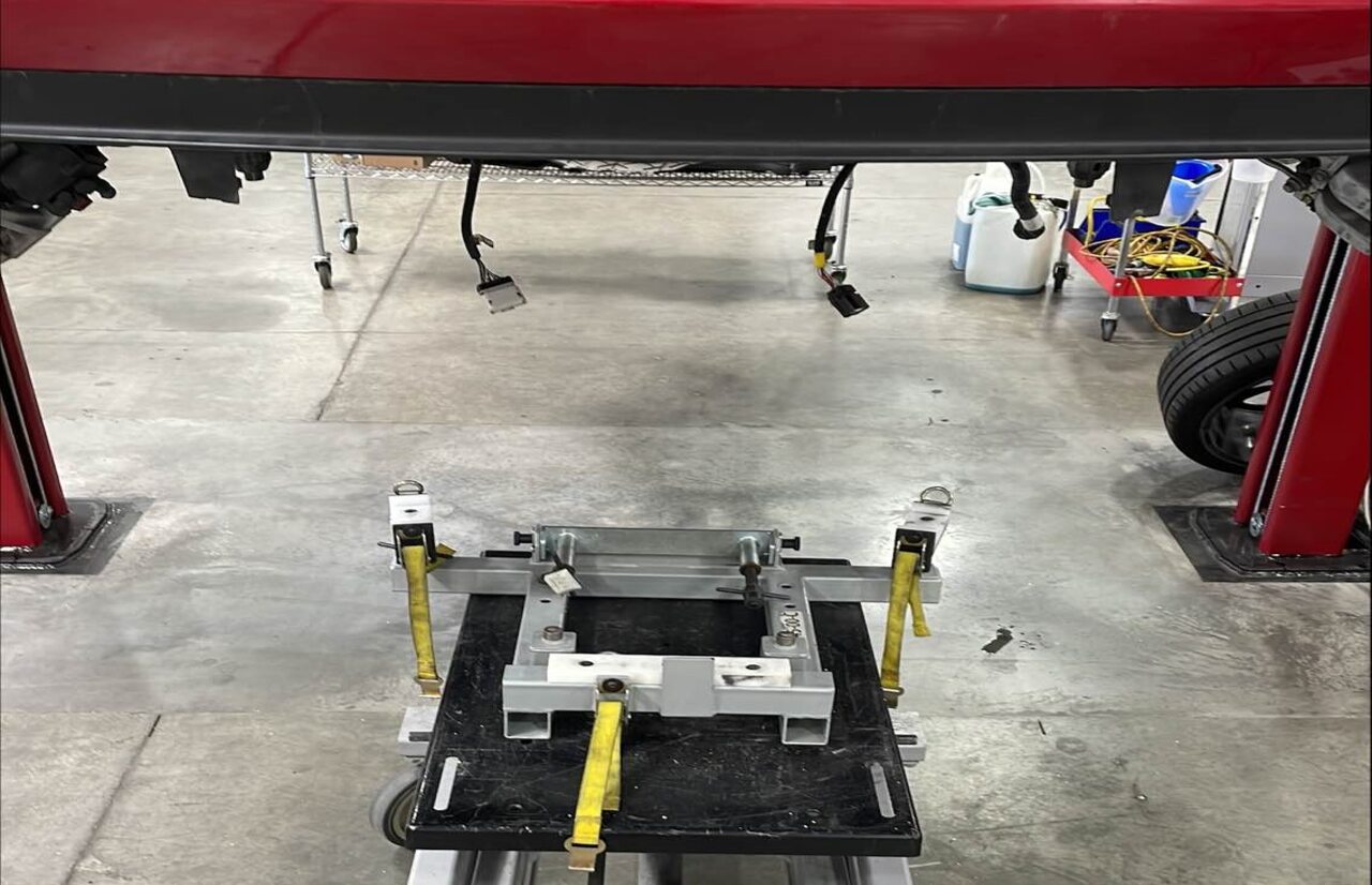 降低副车架举升工具,将其从车辆下方移出。