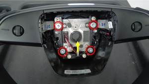 将气囊支架螺栓(4 个)从方向盘上拆下,收集螺栓下方的弹簧(4 个),然后断开连接器。