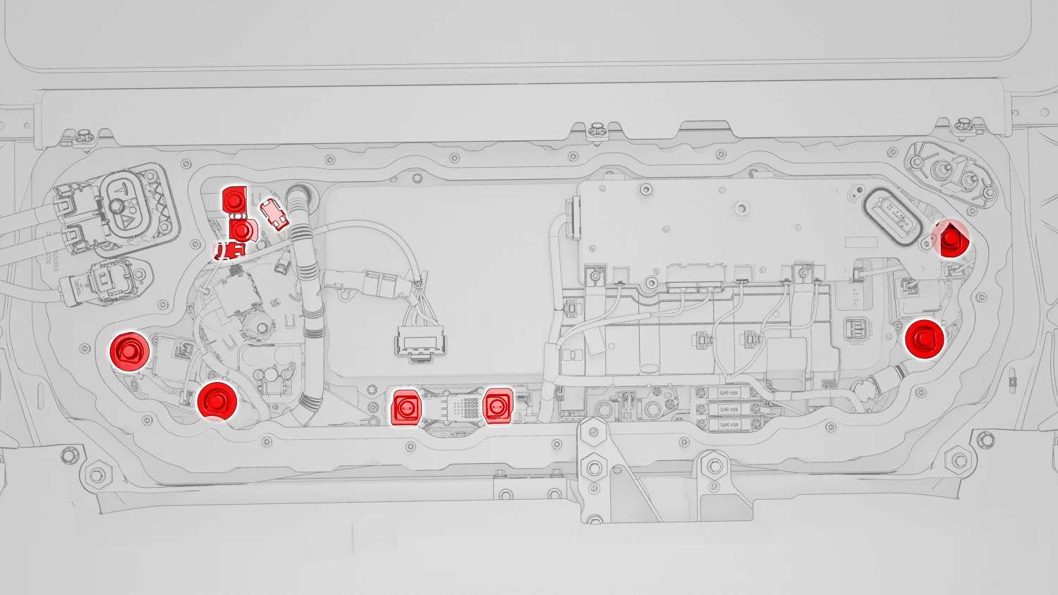 - 需要立即执行高压电池仓漏气测试的情况包括:在高压电池仓盖板垫片上或高压电池接合面上发现损坏、更换了铝胶带改装补片或另一个程序指示现在需要执行该操作。请参阅 高压电池仓漏气测试。