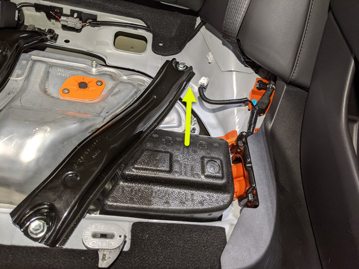 安装一个新螺栓,将座椅锁扣支架、座椅安全带锚固件和高压电池仓内侧纵梁固定到车身上。