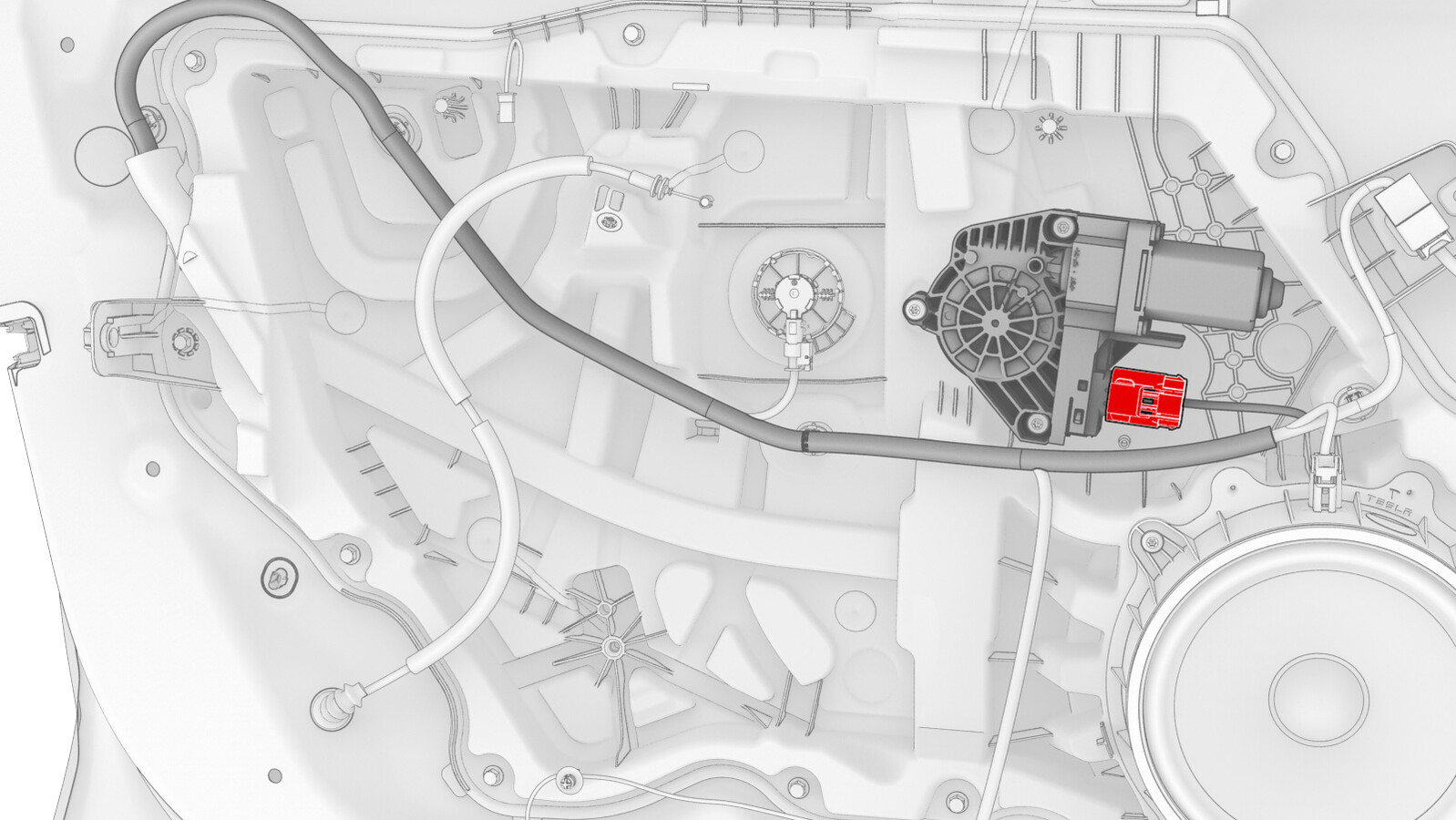 图 1. 图示为封闭板和车窗调整器,为清晰起见,隐藏了其他组件 注拆卸封闭板时,将电气线束穿过封闭板孔。