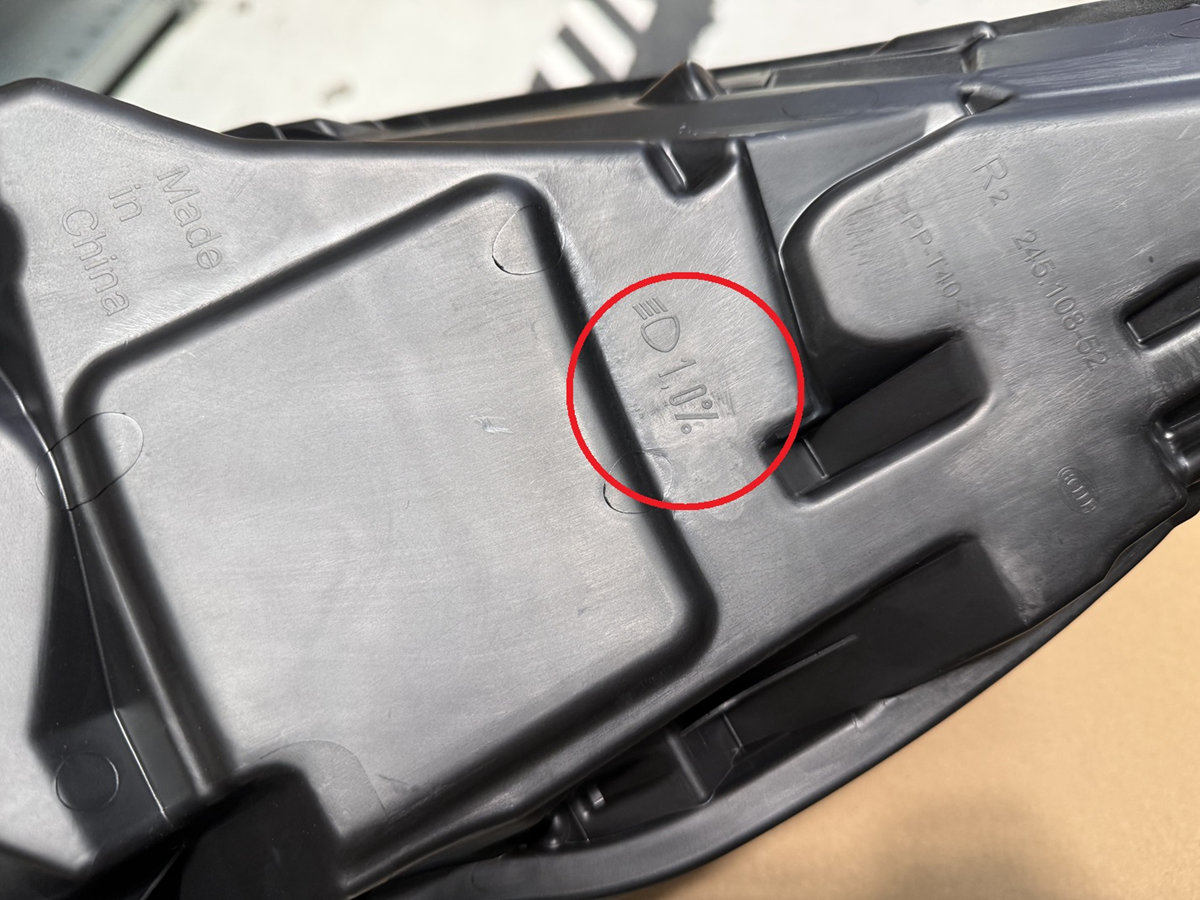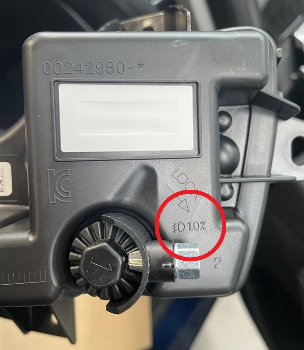 图 1. 刻印在前照灯上的倾角值 图 2. 刻印在前照灯上的倾角值(放大图) 图 3. 刻印在雾灯上的倾角值 - 检查前照灯/雾灯校准时,请勿通过触摸屏将车辆设置为前照灯调整模式。通过 设置到前照灯调整模式后,前照灯光束会出现非标准分布。请勿在定位检查时启用该功能,且该功能仅可由经过训练的人员启用。