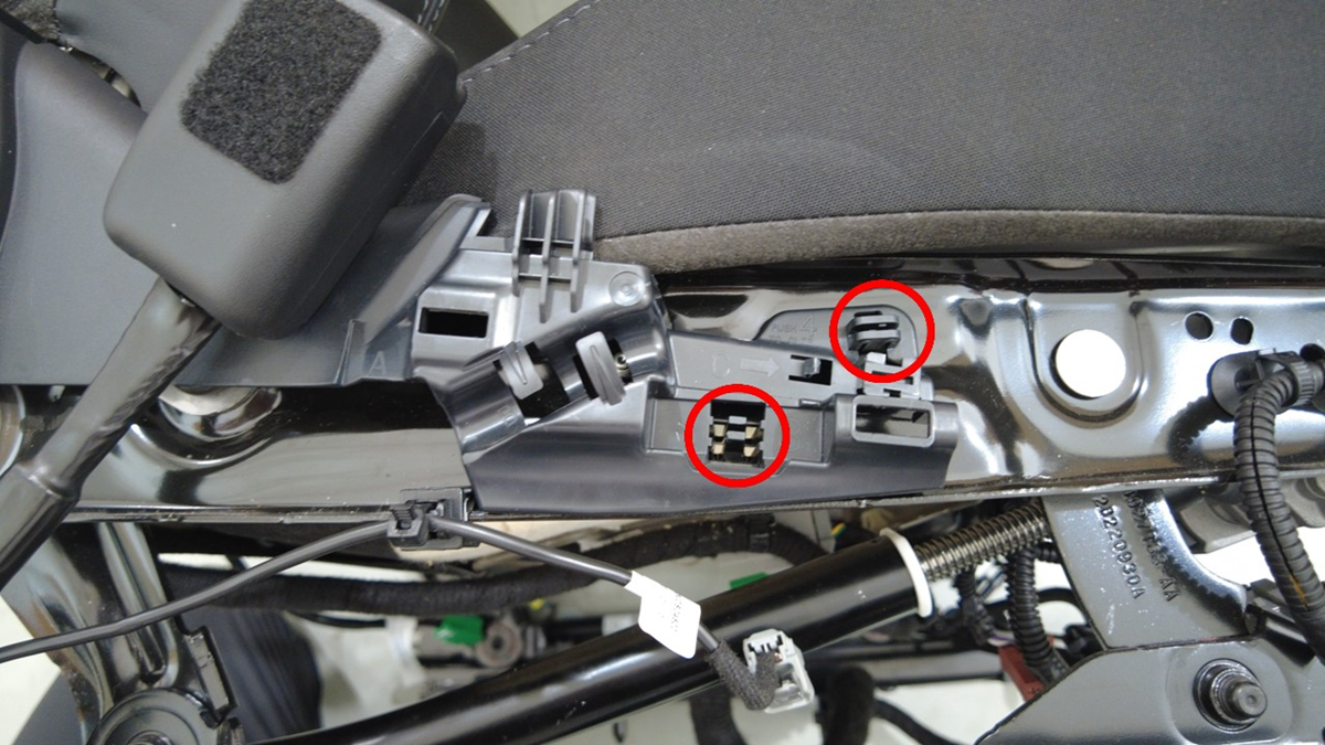 - 断开左前座椅锁扣电气连接器,然后松开用于固定左侧座椅安全带锁扣连接器的卡子。