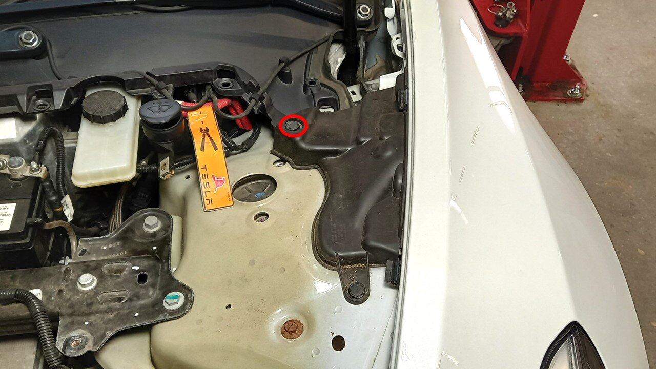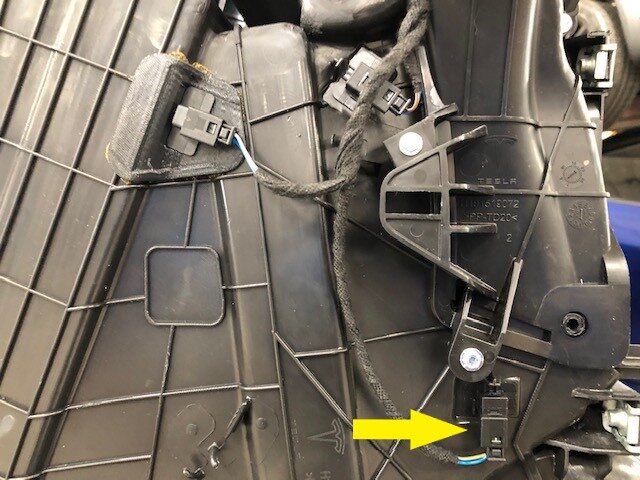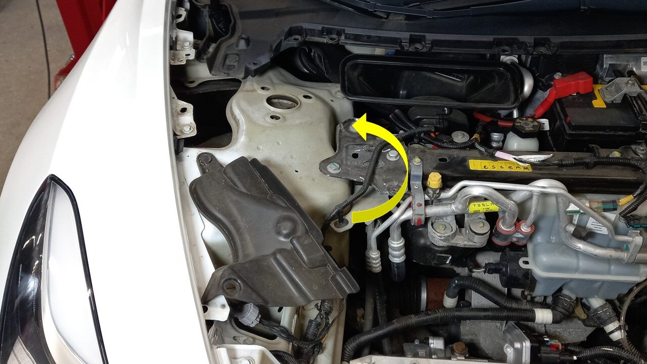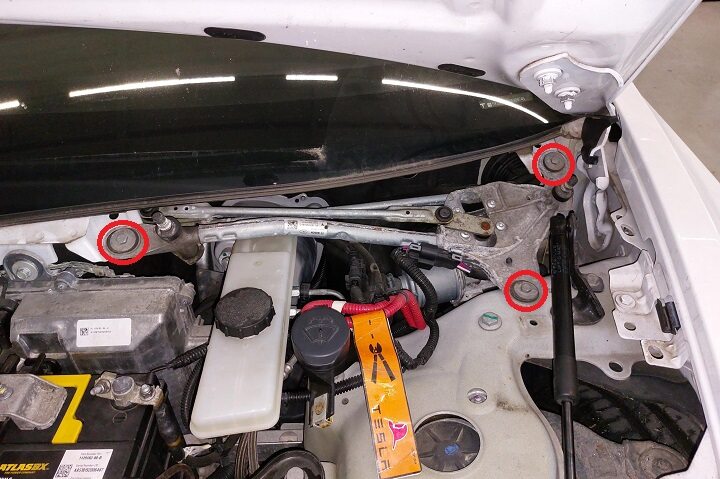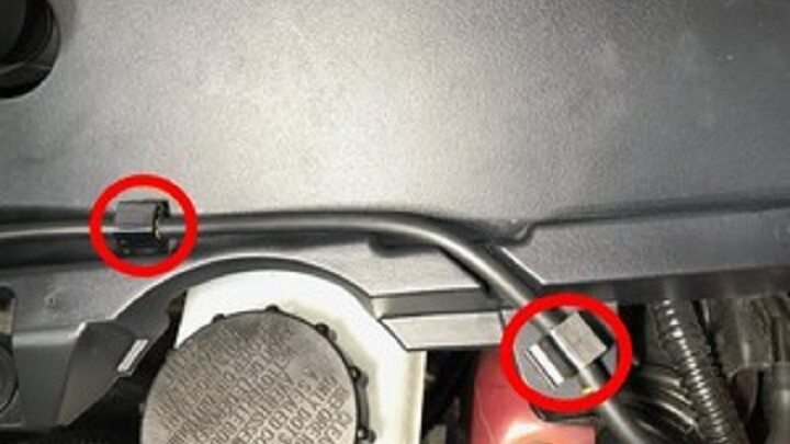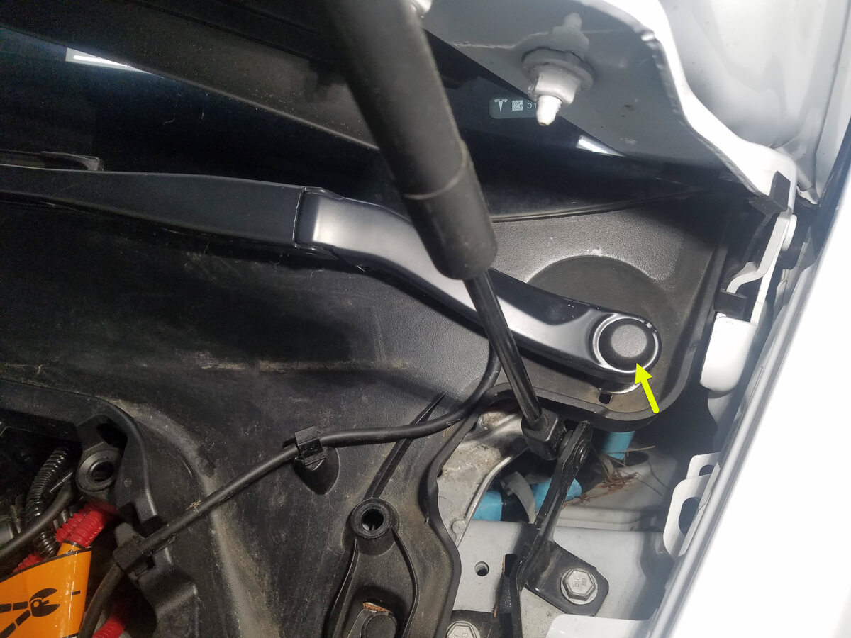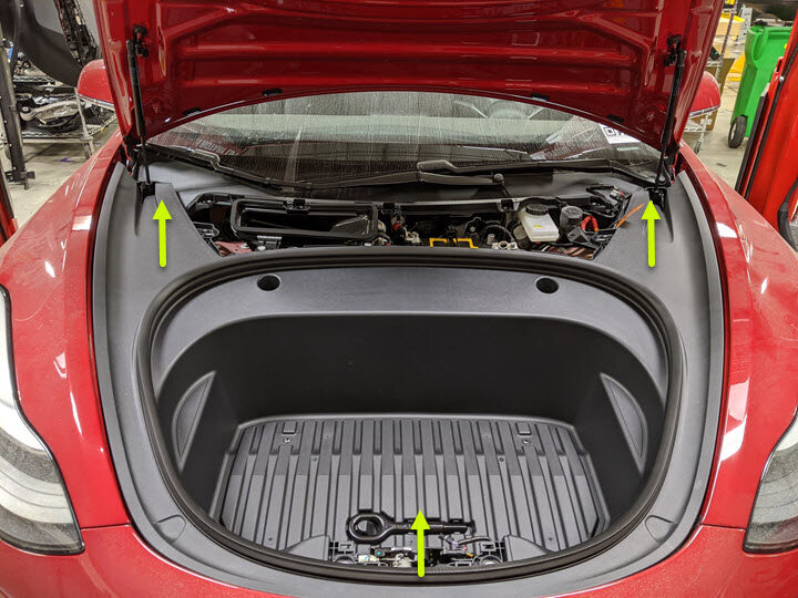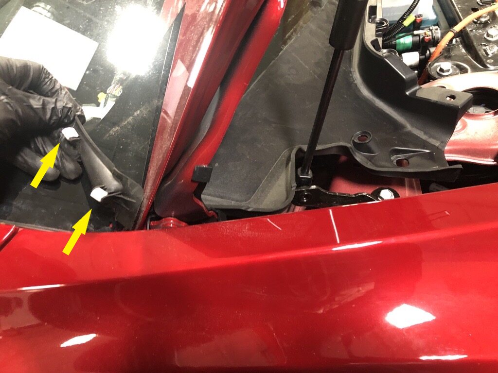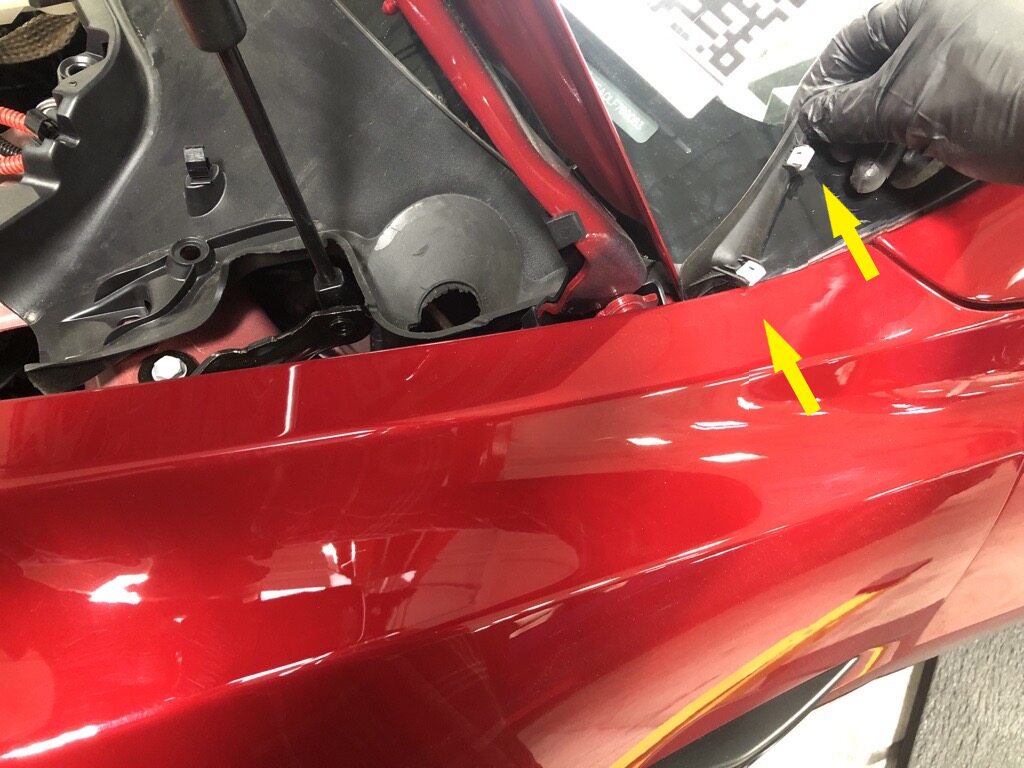注4x clips, 1x connector, Frunk safety switch, 3x guide tabs, Align 3x tabs then push downward to secure clips