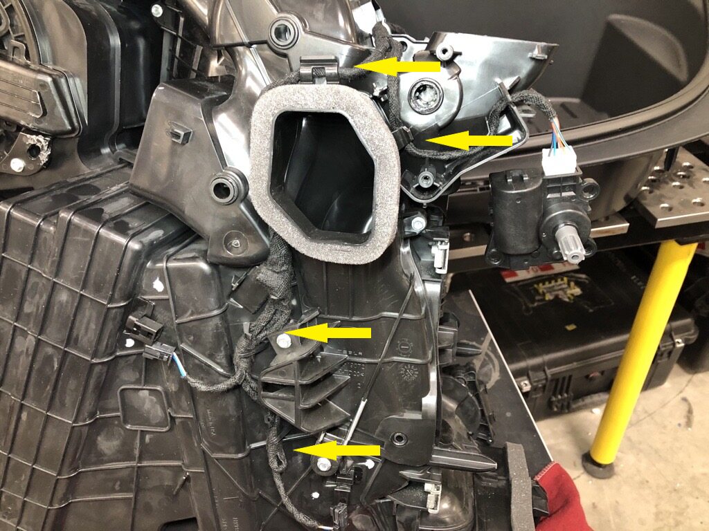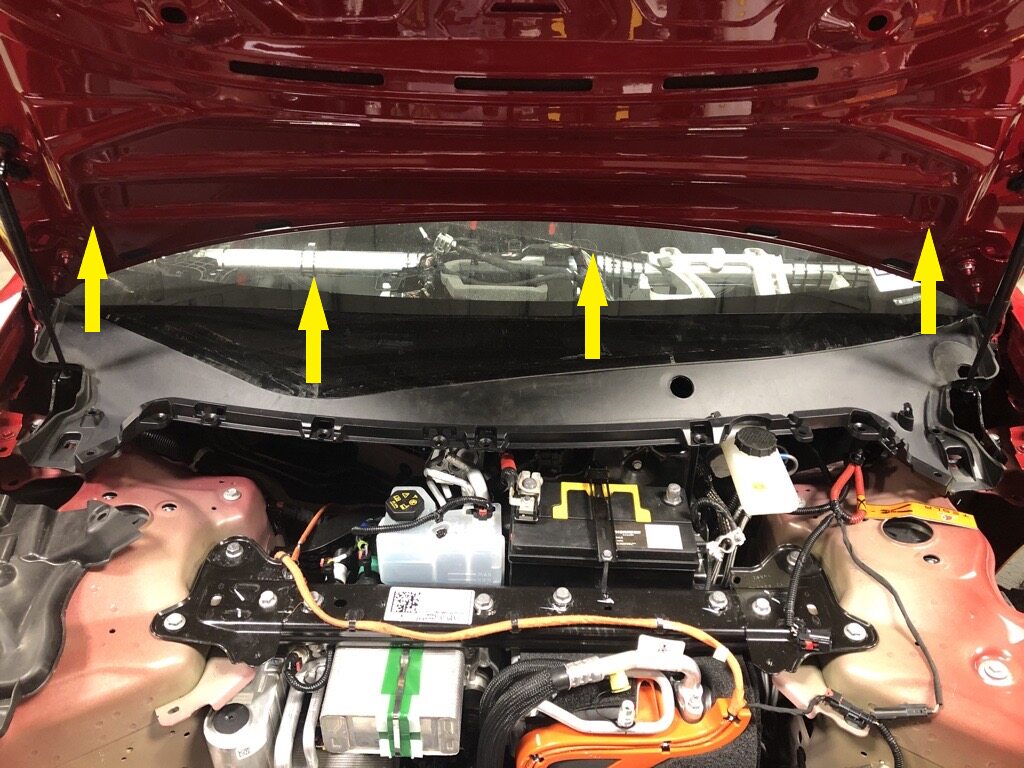 注12x clips, Make sure frunk assembly is fully seated onto clips, Number of clips may vary on older vehicles, Ensure A/C compressor HVIL harness is not pinched between frunk assembly and thermal beam, replace any damaged clips