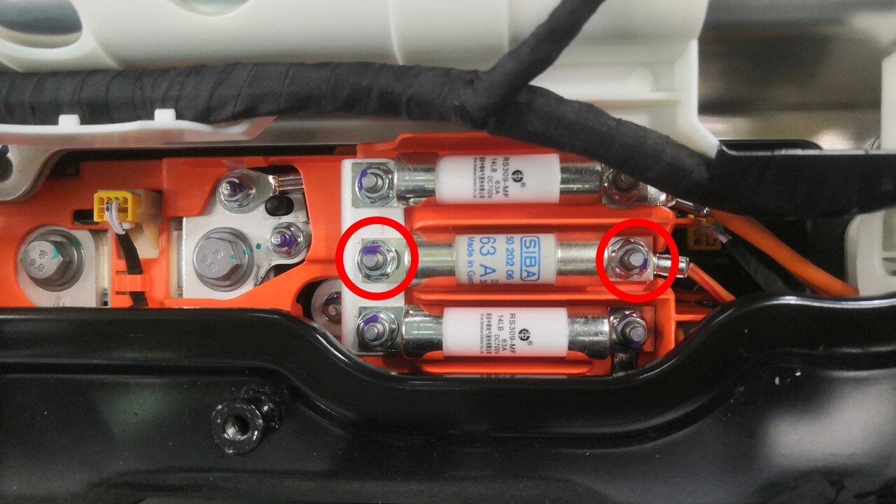 将保险丝安装到高压电池仓右侧总线上,然后安装新的螺母,将保险丝固定到总线上。
