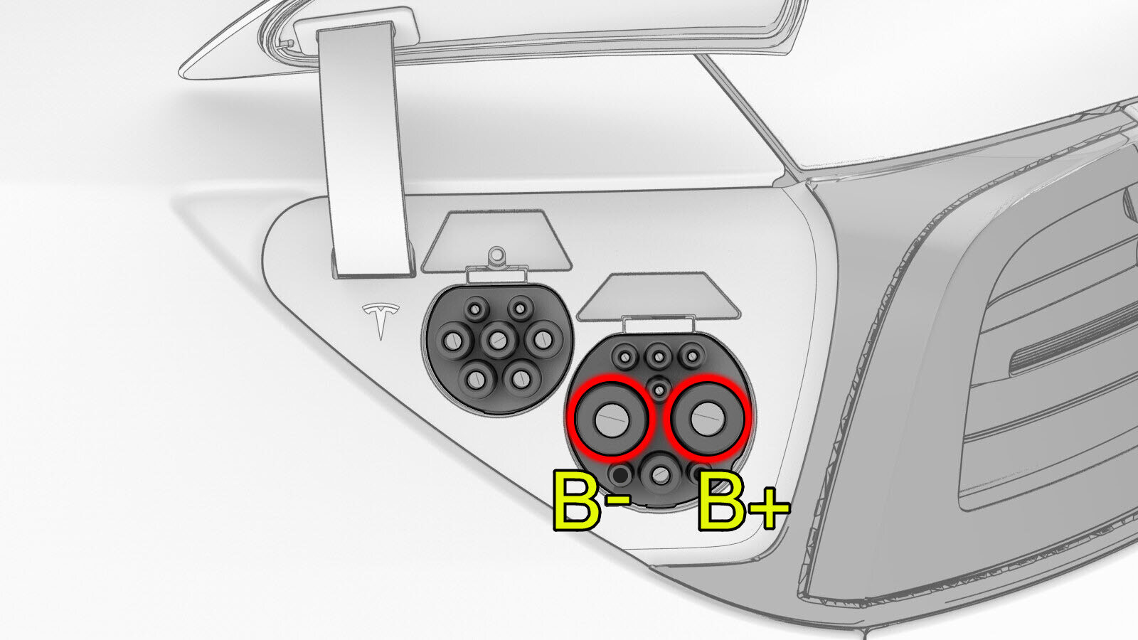 使用万用表检查充电接口直流端子 B- 和接地以及 B+ 和接地的电压。