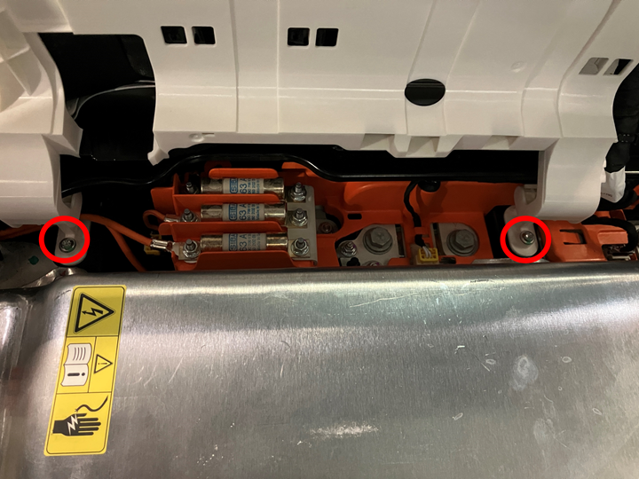 将新的高压控制器铰链托盘 (1101626-00-H) 安装到高压电池仓上。