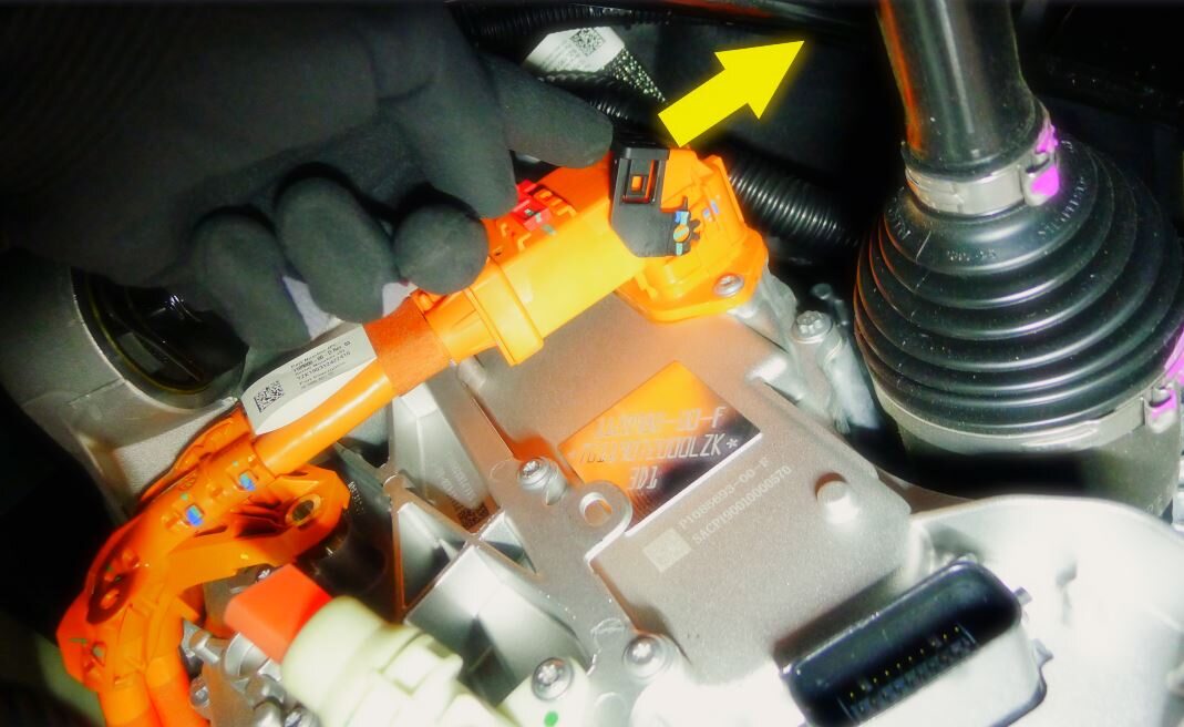 注操作高压部件时,务必佩戴个人防护装备(高压绝缘手套、护目镜),测量 B+ 至接地、B- 至接地、B+ 至 B- 的电压;如果电压大于 10V,则说明电池组触点开关未断开或熔焊;停止作业并联系维修工程部