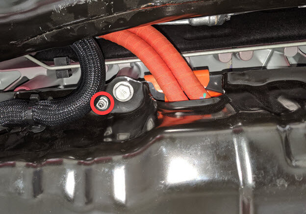 注1 个螺母,10 毫米,6 Nm;确保车辆处于驻车挡,温度控制系统关闭,断开 12V 电池之前车辆未充电