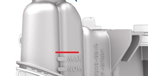 注确保车辆未处于行驶状态;尽管出现停止消息,但计划仍在运行;将听到冷却液泵的声音;测试持续约 10 分钟;可通过 “PT Thermal” 选项卡下的 “Garage” 监测速度;怠速 = 约 1500 RPM,测试速度将在 3500-6500 RPM 之间变化,阀门将并在串联和并联之间切换;将车辆转入行驶状态可停止此例行程序,如果速度徘徊在 7000 RPM 左右,则说明液泵存在气锁状况,请重新执行真空加注;继续添加冷却液并进行排空,直至冷却液液位介于冷却液罐上的 NOM 与 MAX 线之间;完成后,点击右上角的 "X" 关闭窗口 -