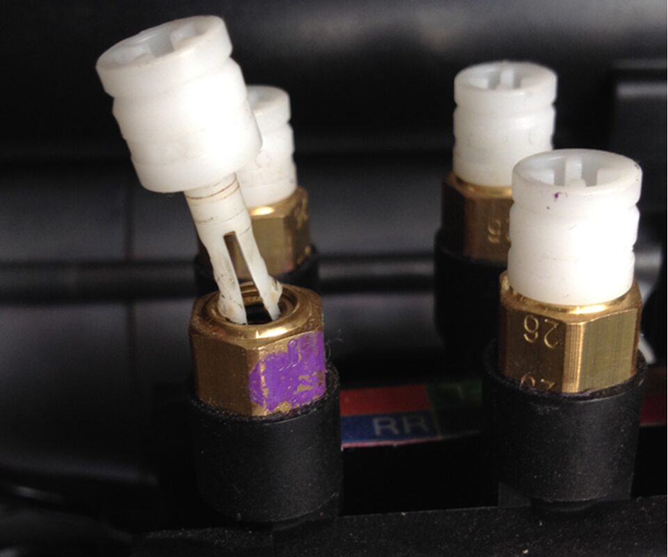 2 Nm (1.5 lbs-ft)NoteRemove the white plugs if not already done. Fully insert the air line into the fitting until it is fully seated. It should sit between the two white marks on the air line. Make sure that the air lines are properly secured by performing a push and pull test. - Raise vehicle to a comfortable working height.