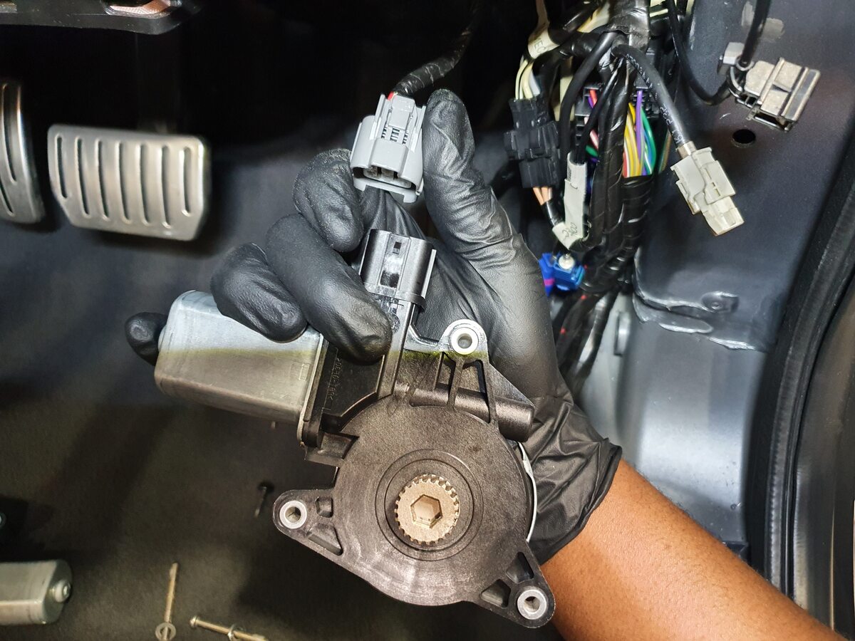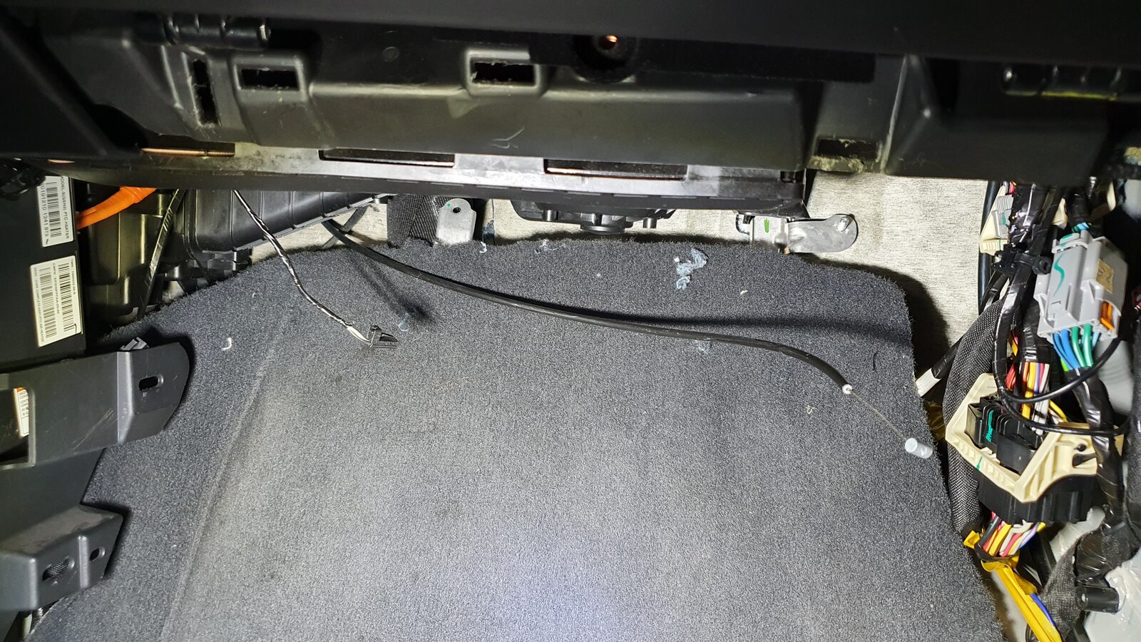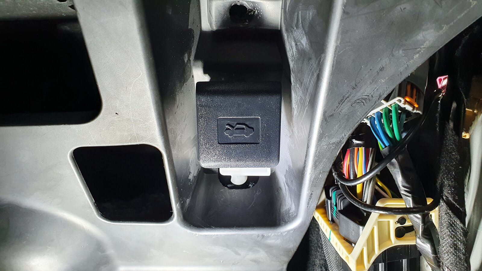 Note2x screws, T20, 2 Nm, 1x connector, Remove manual hood cable from handle to release footwell cover