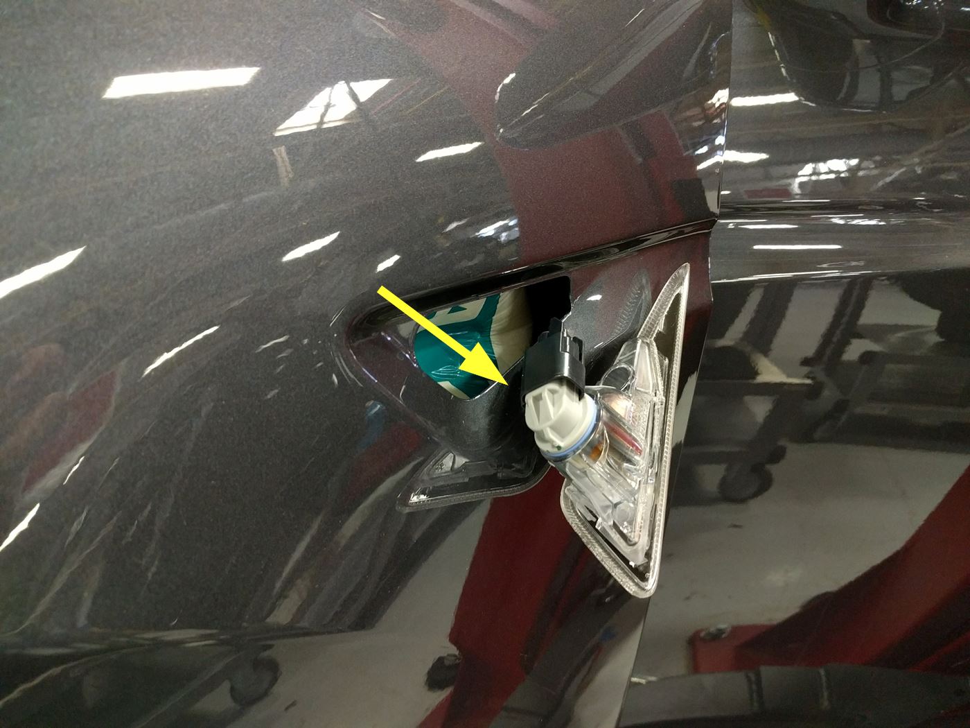 front and bottom-facing edges of the LH front side repeater lamp, and then