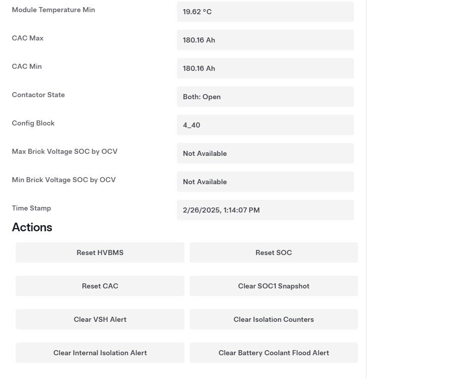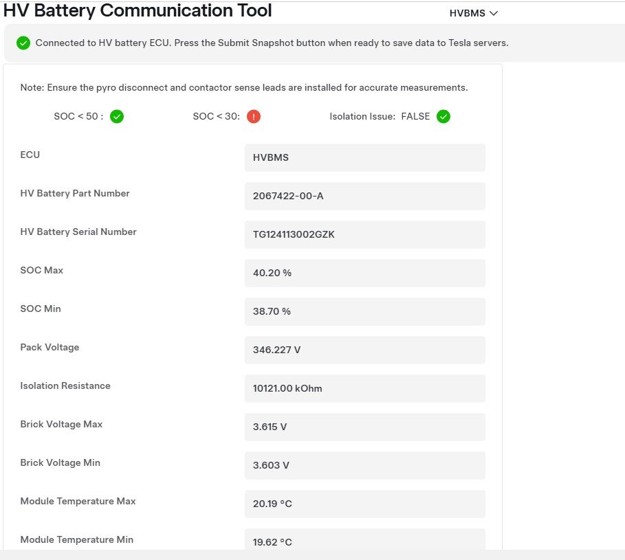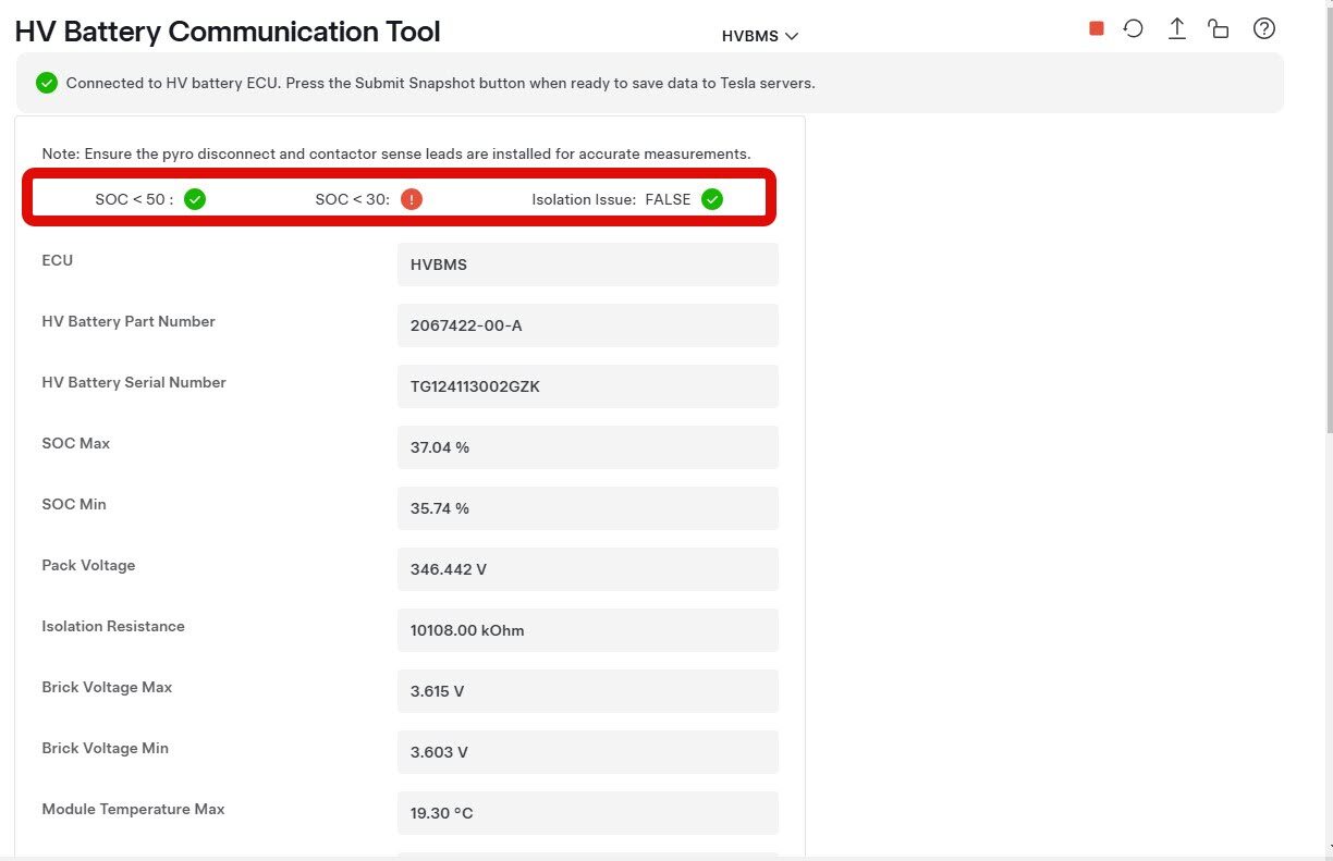 NoteRefer to Toolbox article 41977, The HV vitals are not stable if any of the following is true:Module temperatures are significantly higher than ambient temperature.Module temperatures min and max deviate from each other more than 5 degrees C.Brick voltages min and max deviate more than 20 mV.If vitals are not stable, isolate the pack or vehicle in 30 meter bubble.
