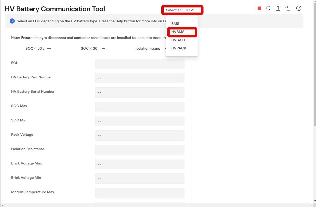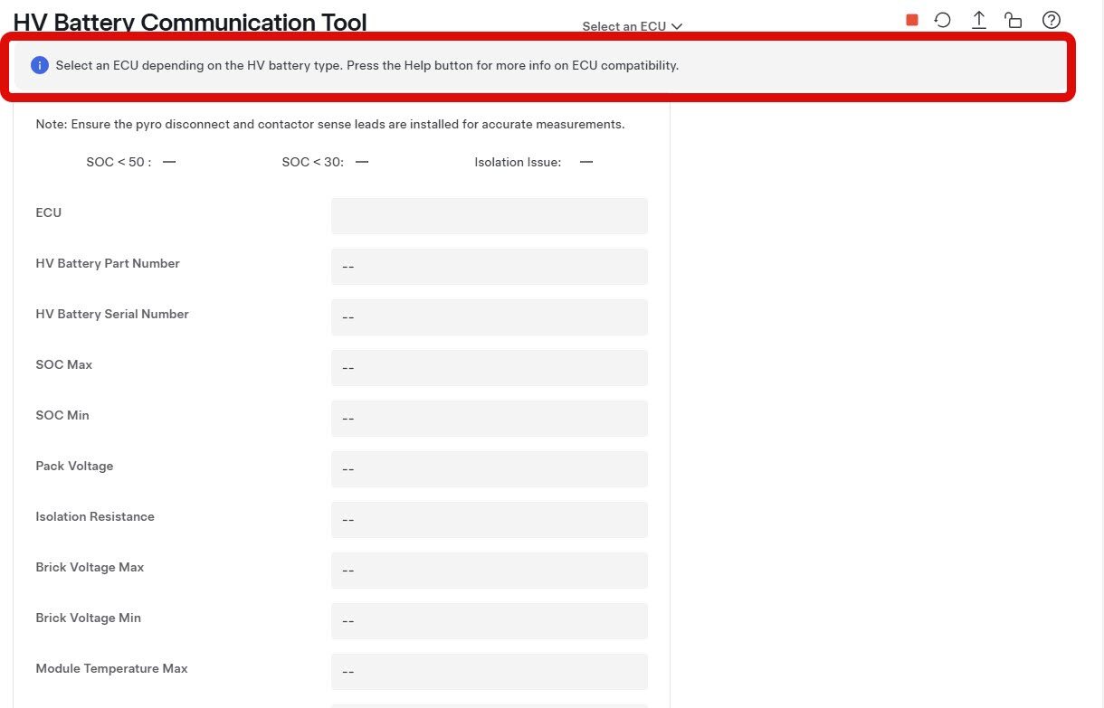 NoteIf PCAN is detected there will be a message on top of the HV Battery Communication Tool, "Select an ECU depending on the HV battery type. Press the Help button for more info on ECU compatibility."