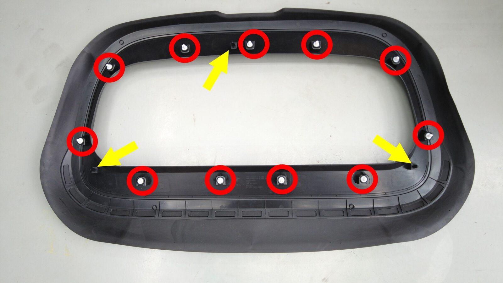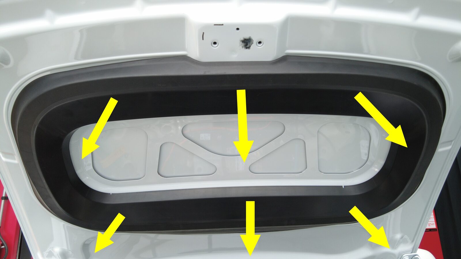放置好定位销(3 个),然后紧固将前备箱盖挡板固定到前备箱盖的卡子(11 个)。