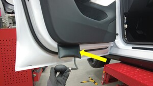 使用塑料饰板工具将可充气袋插入左前车门饰板左下角,然后向袋内充气,以松开左下卡子。