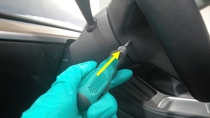 将阀芯拆卸工具 (1143985-00-A) 插入方向盘的孔中,插入深度刚好够同时压住弹簧夹,然后从方向盘上拆下驾驶位气囊。