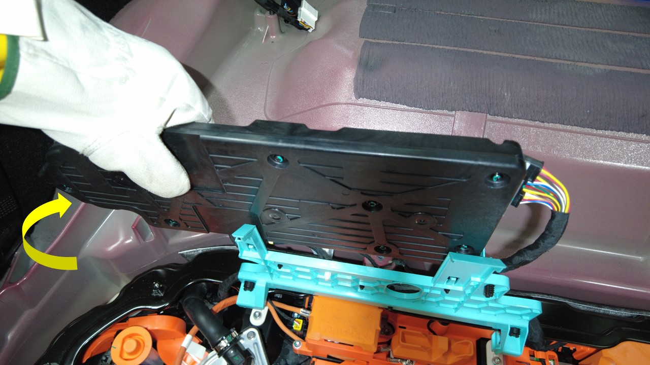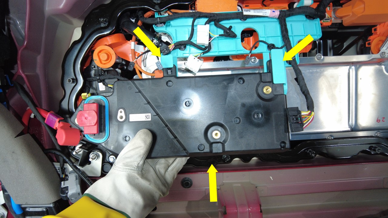 将高压控制器向上抬离高压电池仓并松开锁片(2 个),然后将控制器从卡槽(2 个)上拆下。