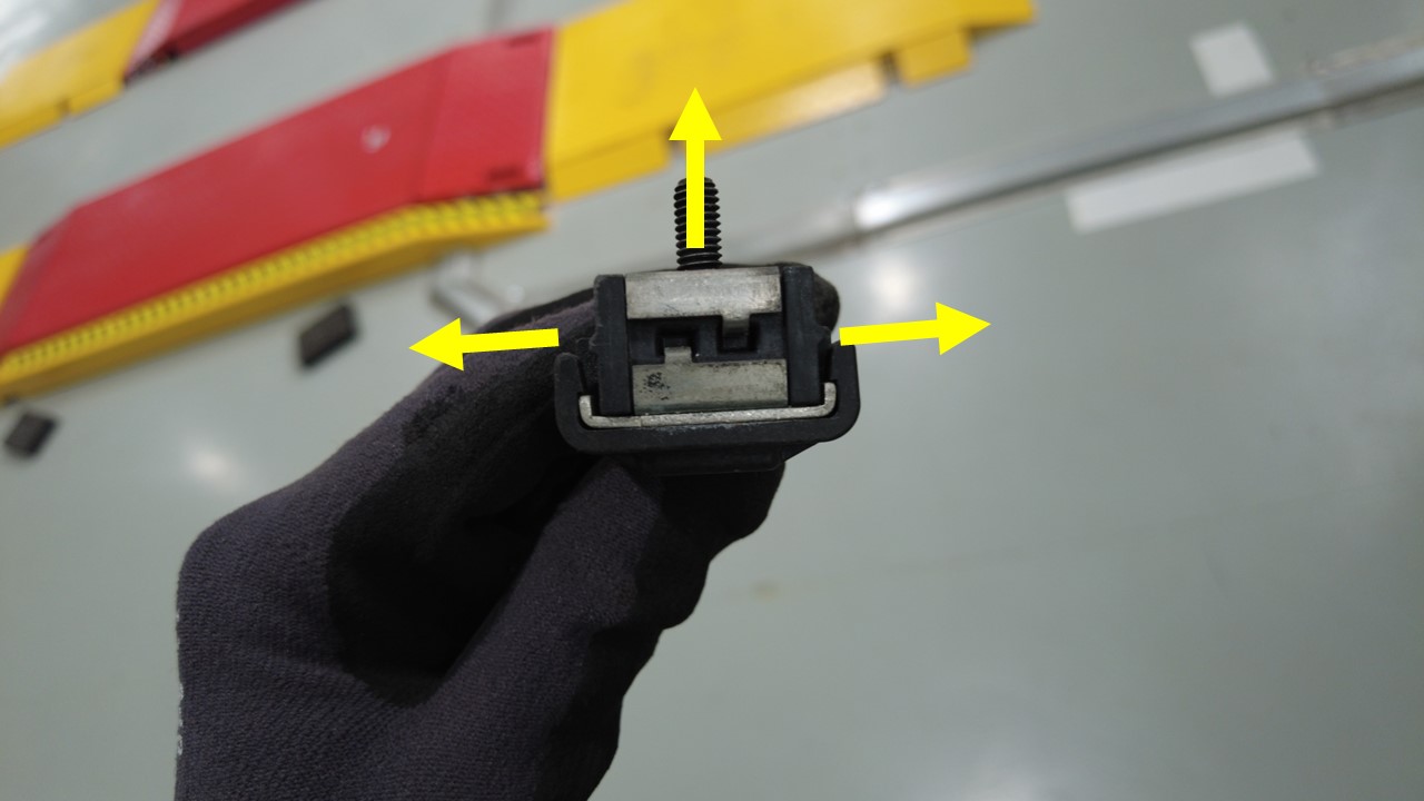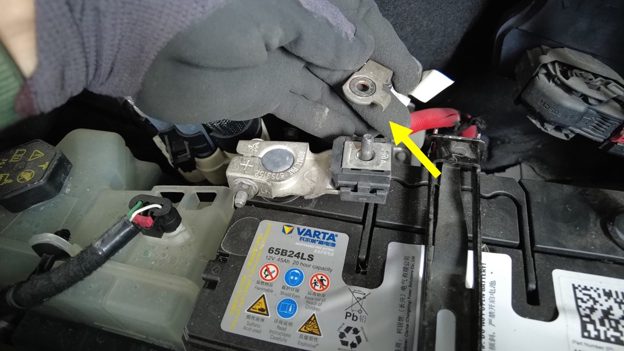 松开两侧的锁片,然后将微型保险丝从 12V 电池正极保险丝座上拆下。