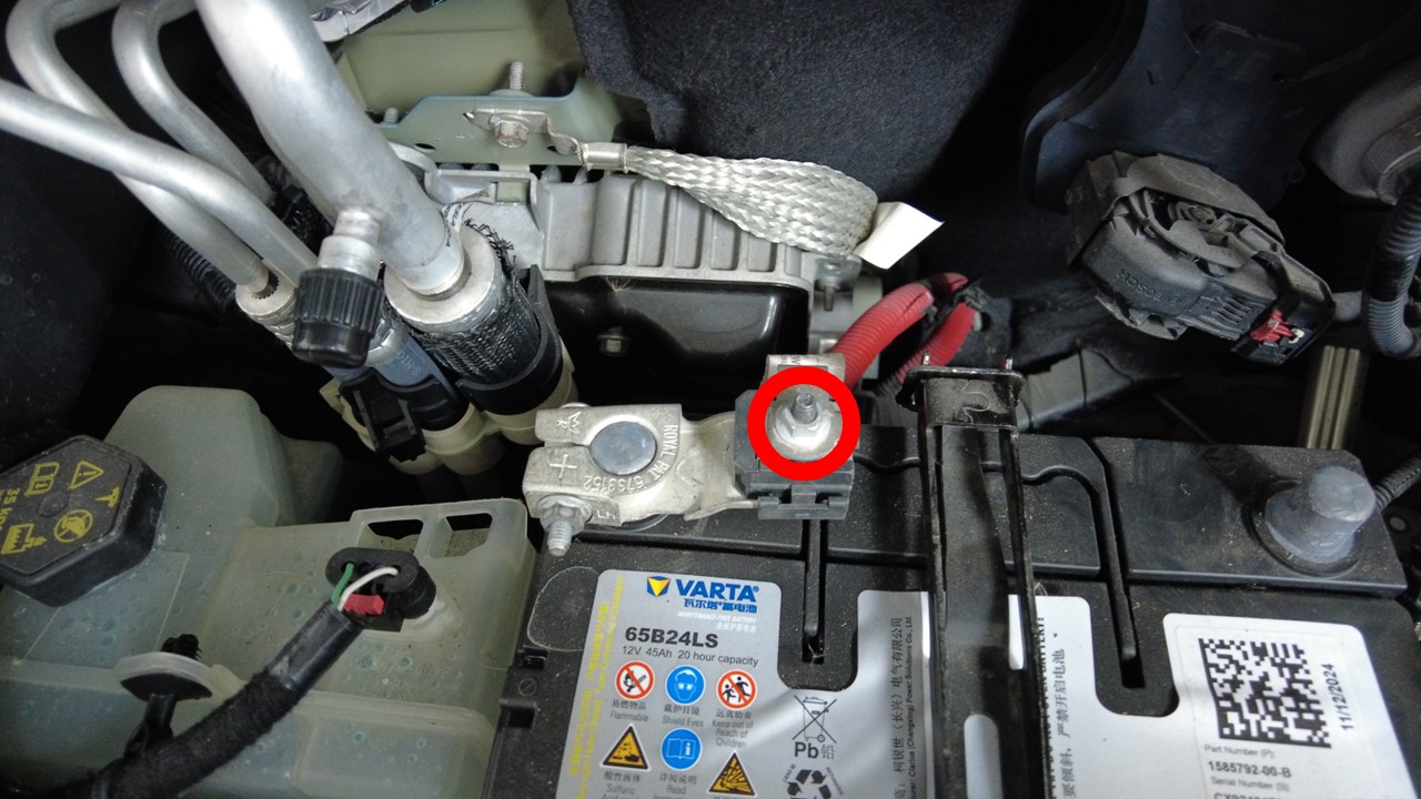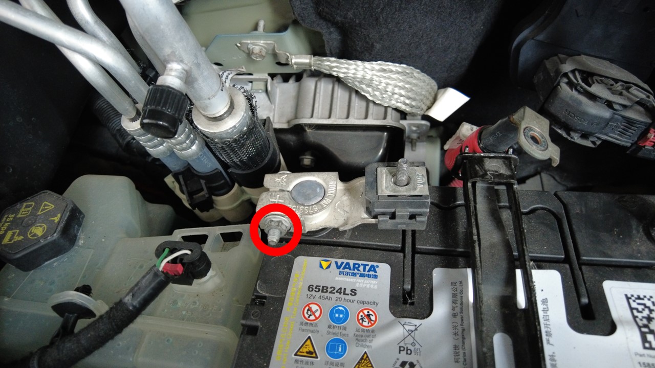 松开将正极端子和保险丝固定到 12V 电池的螺母。