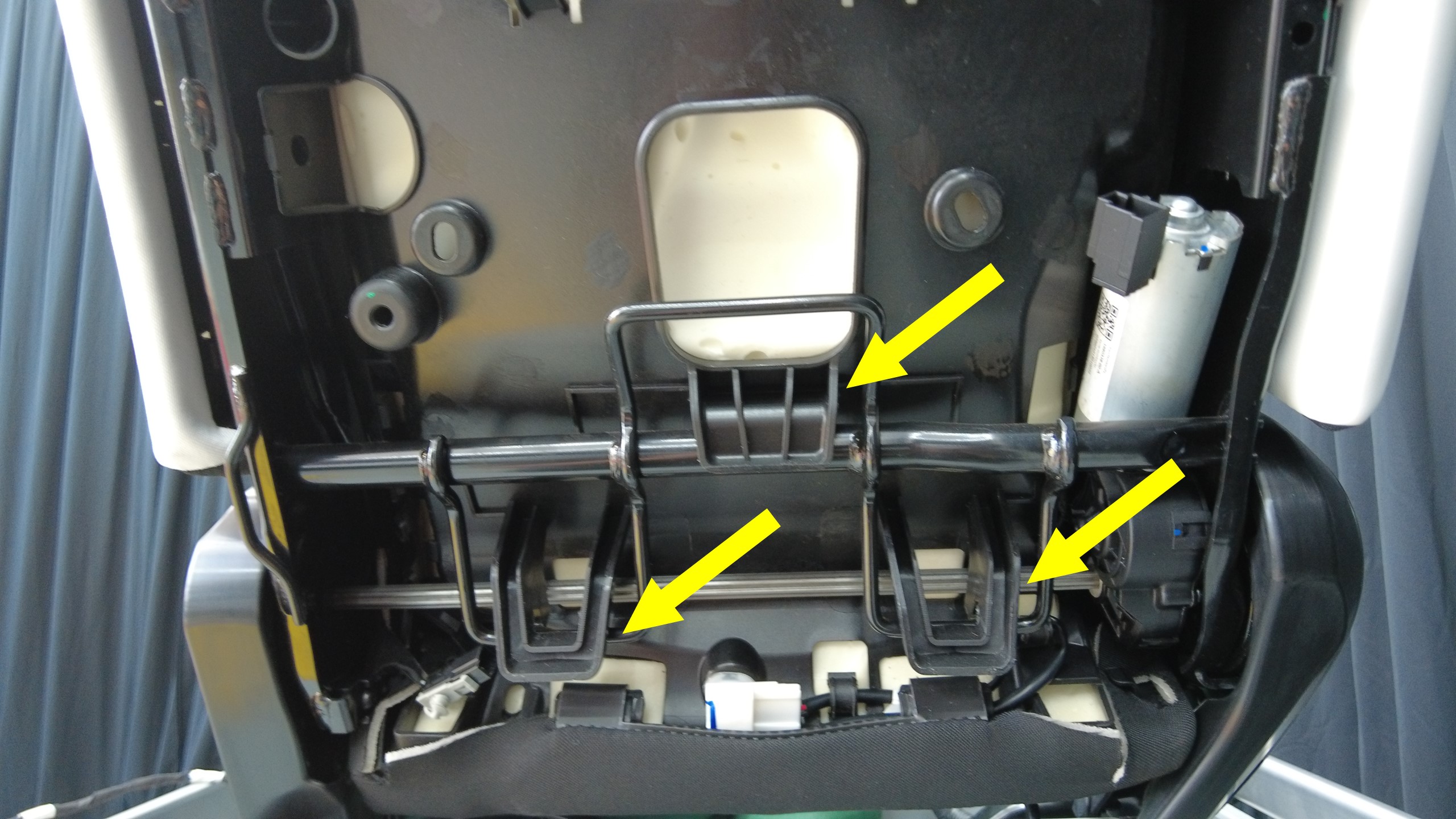 注3x hooks, 1x tab, Push tab forward, and Lift up and unhook from seat railing.