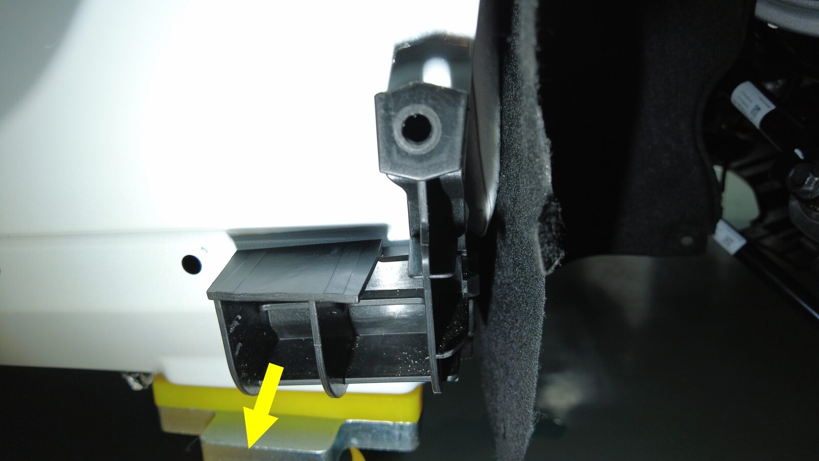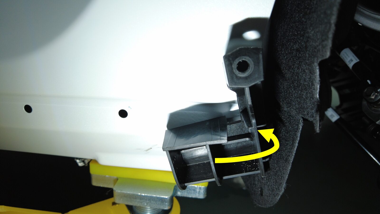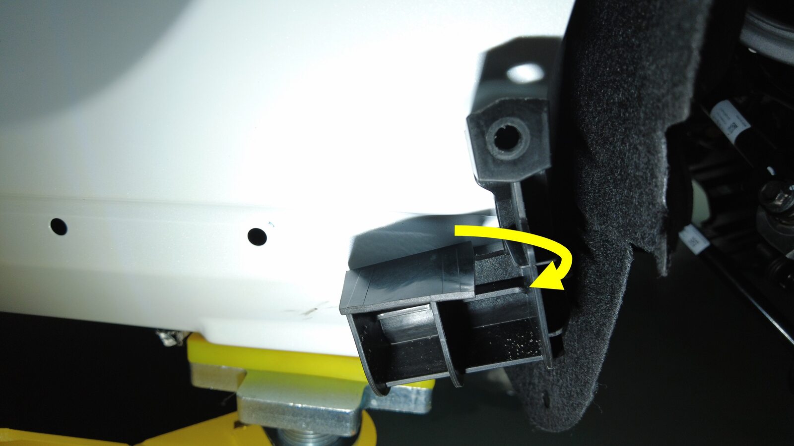 将支架上的锁片与左后翼子板下部的开孔对齐,将支架朝车头方向旋转以使支架边缘与车身接合,然后下压门槛支架,使其紧贴在车身上。